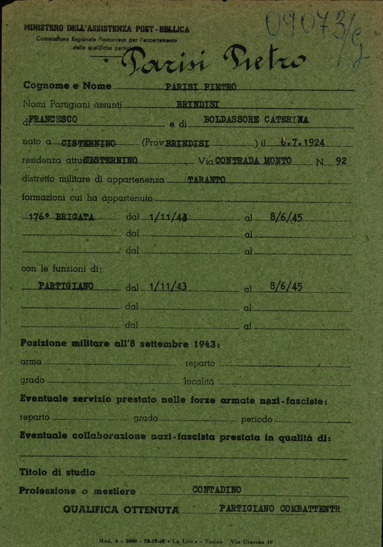 Pietro Parisi aveva militato nella 176ª Brigata Garibaldi dal 1° novembre 1943 al 7 giugno 1945 in Valle d’Aosta rendendosi protagonista, con altri partigiani, di azioni coraggiose ed eroiche contro i nazisti e contro i fascisti, mettendo a serio rischio la vita. Il suo impegno per la Memoria è stato costante. Le sue ceneri sono state sparse, per suo volere, a Issogne, in Valle d’Aosta, in quei boschi e in quelle terre che lo hanno visto combattere da Partigiano.