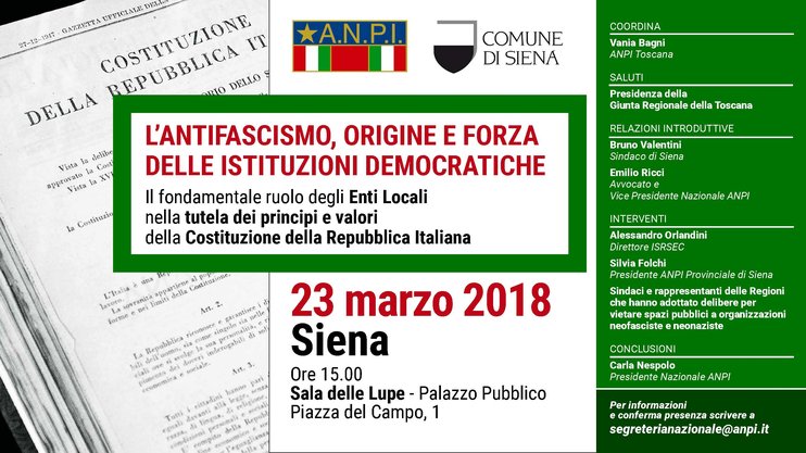 Si è svolto il 23 marzo a Palazzo Pubblico di Siena, nella Sala delle Lupe, il convegno nazionale “L’antifascismo, origine e forza delle istituzioni democratiche”, organizzato da Anpi e Comune di Siena e dedicato al ruolo degli Enti locali nella tutela dei principi e dei valori della Costituzione italiana.
