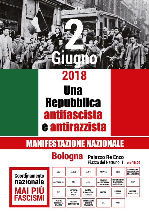 ECCO IL MANIFESTO DELLA MANIFESTAZIONE NAZIONALE DEL 2 GIUGNO A BOLOGNA PROMOSSA DAL COORDINAMENTO “MAI PIÙ FASCISMI”.