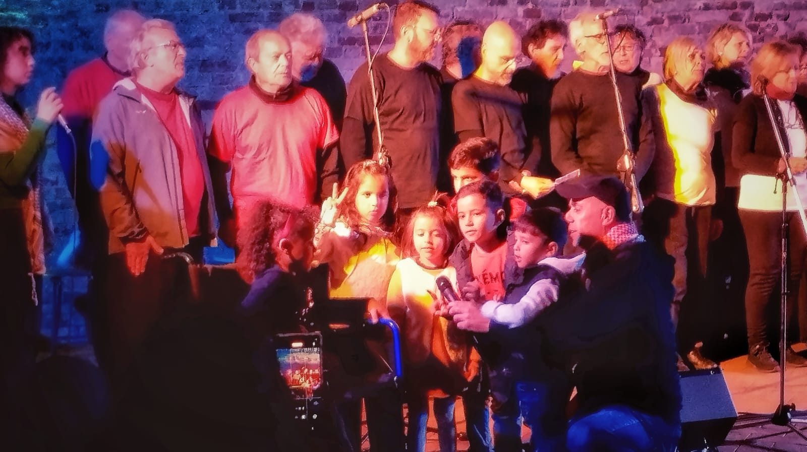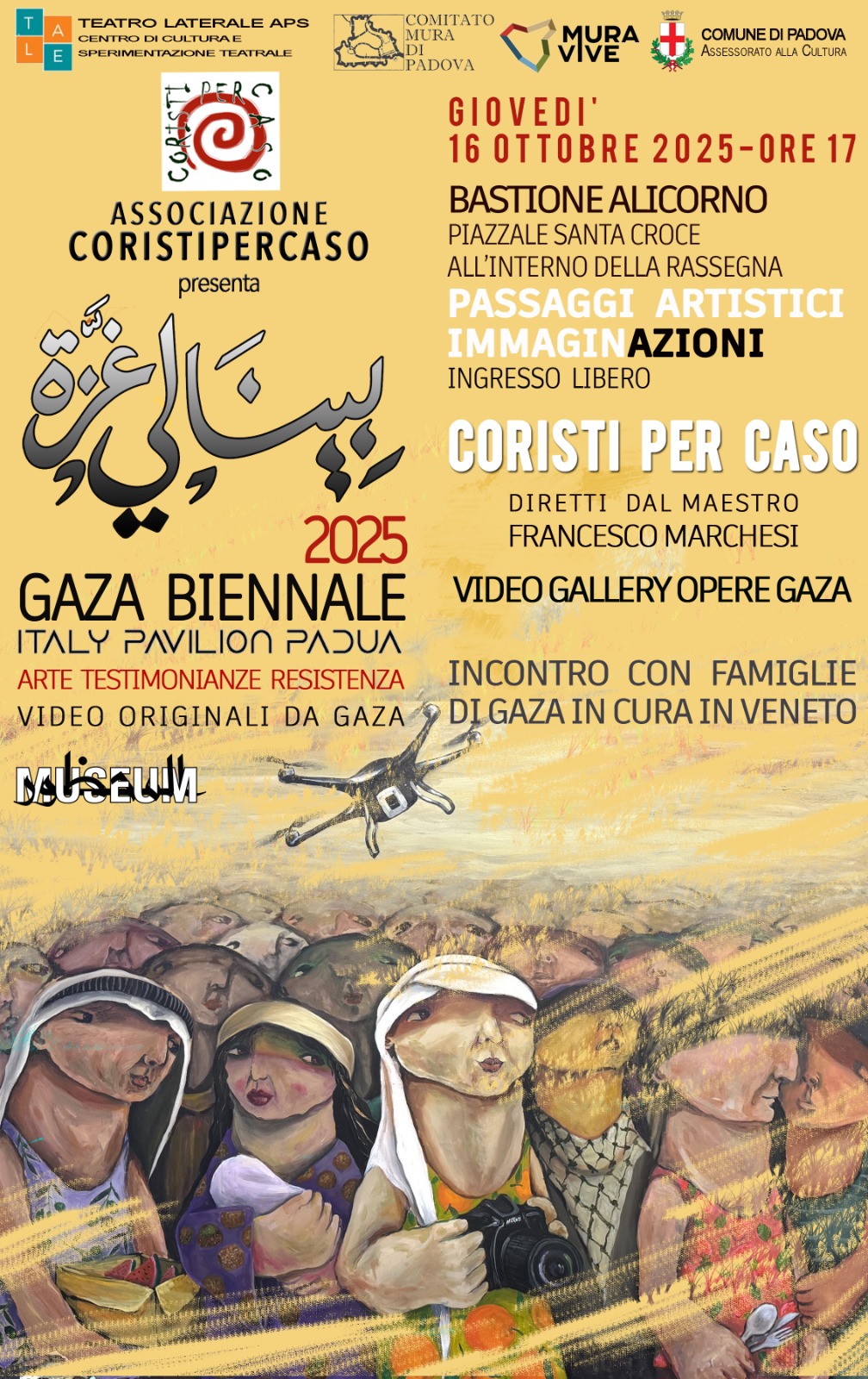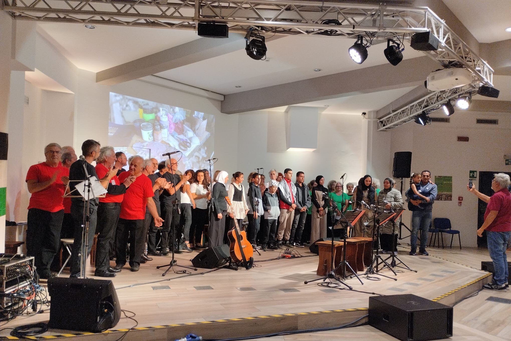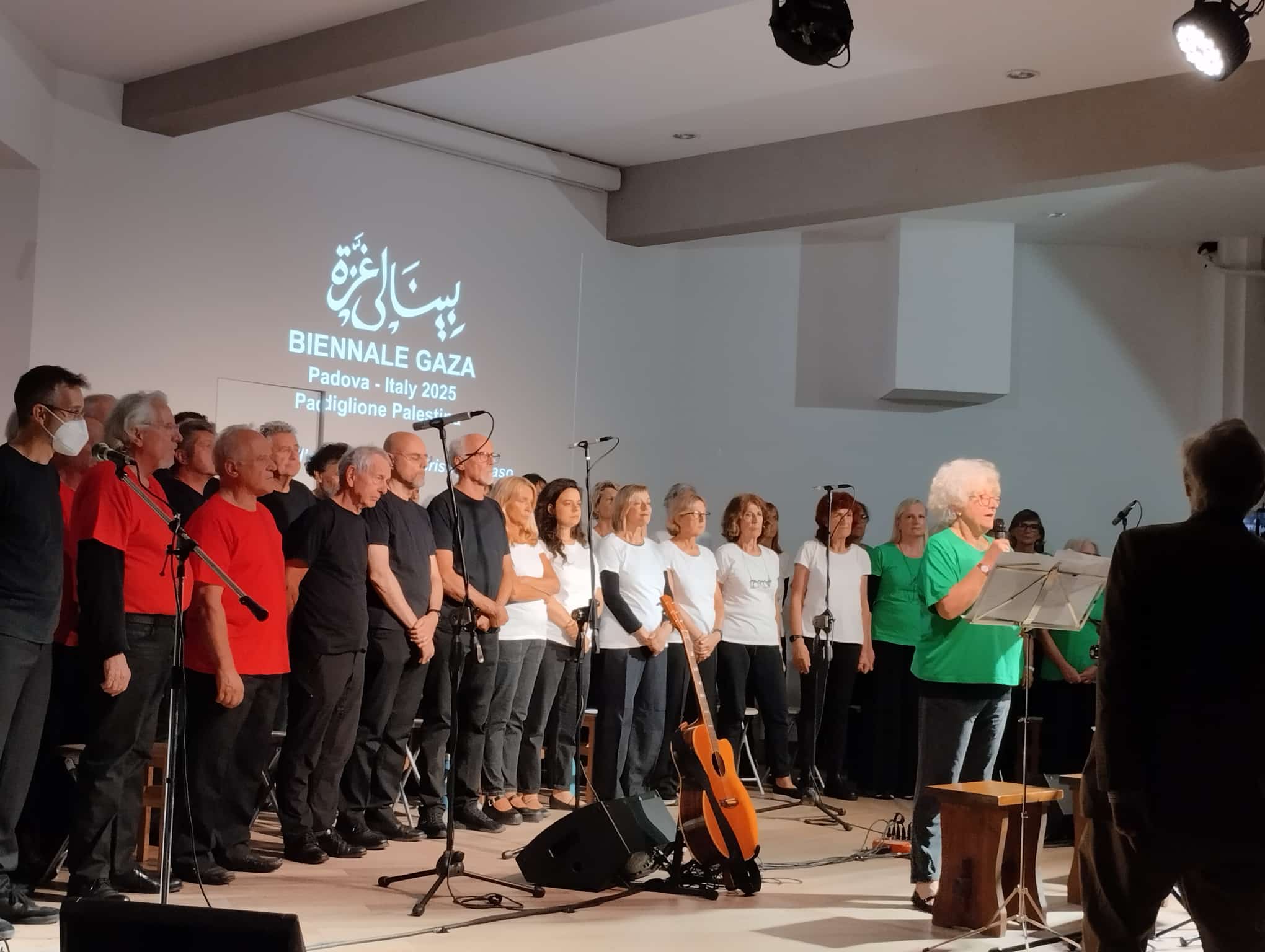 Tutto è iniziato dalla lettura di un pezzo di Tomaso Montanari. Un anno fa. Raccontava il progetto di questo gruppo di persone, di artisti, di Gaza. Ci siamo messi in contatto con Montanari, che ha scritto la prefazione al catalogo che abbiamo realizzato, e con gli organizzatori del progetto, a Gaza. Mesi di mail, chat, videochiamate con loro a volte al buio, sotto le bombe. Abbiamo raccolto il materiale, scelto e tradotto le molte testimonianze, fatto un video con le opere. Il tutto, assieme ai brani cantati dal coro, è diventato una sorta di spettacolo che da giugno a settembre abbiamo replicato 5 volte, sempre tutto esaurito. Ogni volta con tanti ospiti, famiglie e artisti palestinesi, ma anche David Riondino, Stefano Allievi, Don Nandino Capovilla…