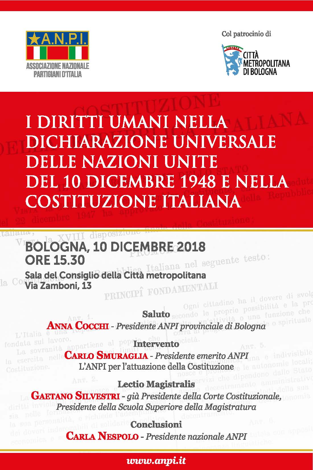 A Bologna, il 10 dicembre, dopo un’informazione sul lavoro che abbiamo fatto e stiamo concludendo, ci sarà una lectio magistralis del professor Gaetano Silvestri (già Presidente della Corte Costituzionale e ora Presidente della Scuola superiore della Magistratura) sul tema “I diritti umani nella Dichiarazione universale dell’ONU e nella Costituzione italiana”. Una manifestazione nazionale, per sottolineare, al tempo stesso, la ricorrenza del 10 dicembre, la stretta corrispondenza tra i principi generali della Costituzione italiana e quelli fondamentali della Dichiarazione dell’ONU ed infine l’estrema attualità, (per ragioni che non ho bisogno di specificare) dei “diritti umani”.