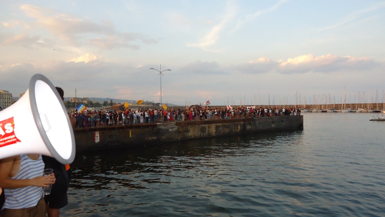 Poi, i manifestanti, con un lungo corteo costituito da alcune migliaia di persone, hanno attraversato gran parte dell’area portuale, dopo un percorso di ottocento metri, spostandosi al molo che guarda direttamente la nave dei profughi, a circa 300 metri di distanza. Grandi cori hanno caratterizzato questa seconda manifestazione, per portare il saluto e il sostegno unanime ai profughi, affacciati dalla parte laterale della nave. Sono state fatte innalzare piccole mongolfiere di carta e sparati fuochi di artificio in segno di solidarietà.