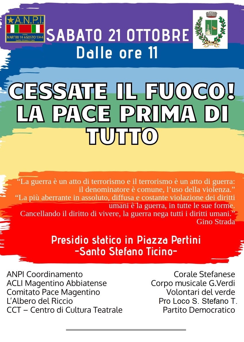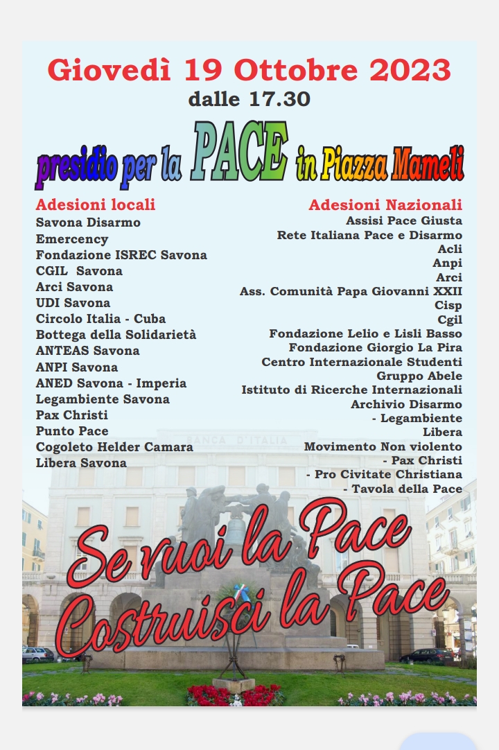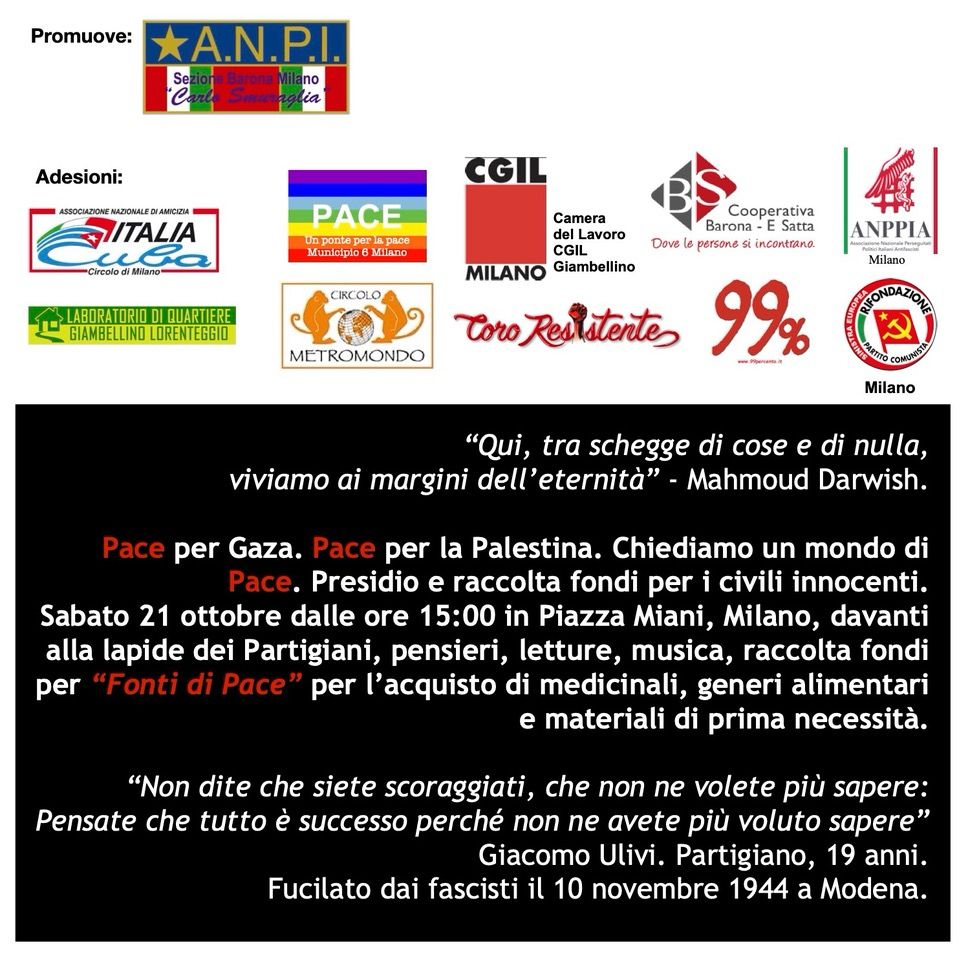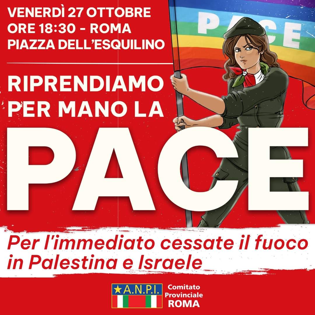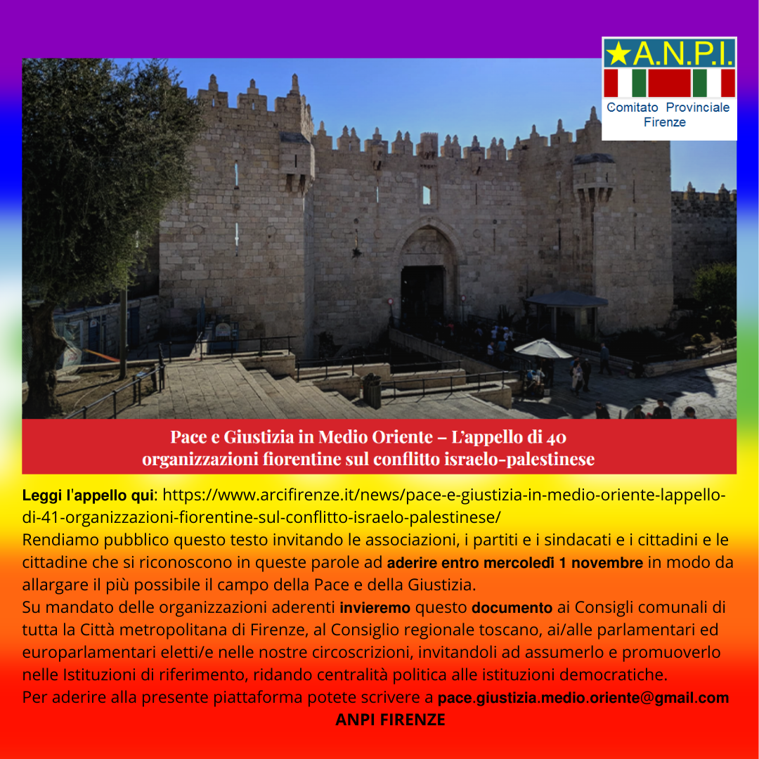 Oggi con il fiato sospeso perché stamattina, dopo altri bombardamenti nella notte, è scaduto l’ultimatum israeliano, le Anpi tornano a pretendere azioni concrete di pace a Firenze, Bari, Perugia perché non è tollerabile l’assedio di Gaza e il terrorismo non può conoscere giustificazioni. Presidi e cortei si terranno pure domani e proseguiranno la prossima settimana, annunciano le prime locandine che stanno arrivando al nazionale Anpi da Modena, Novara, Rimini, Catanzaro.