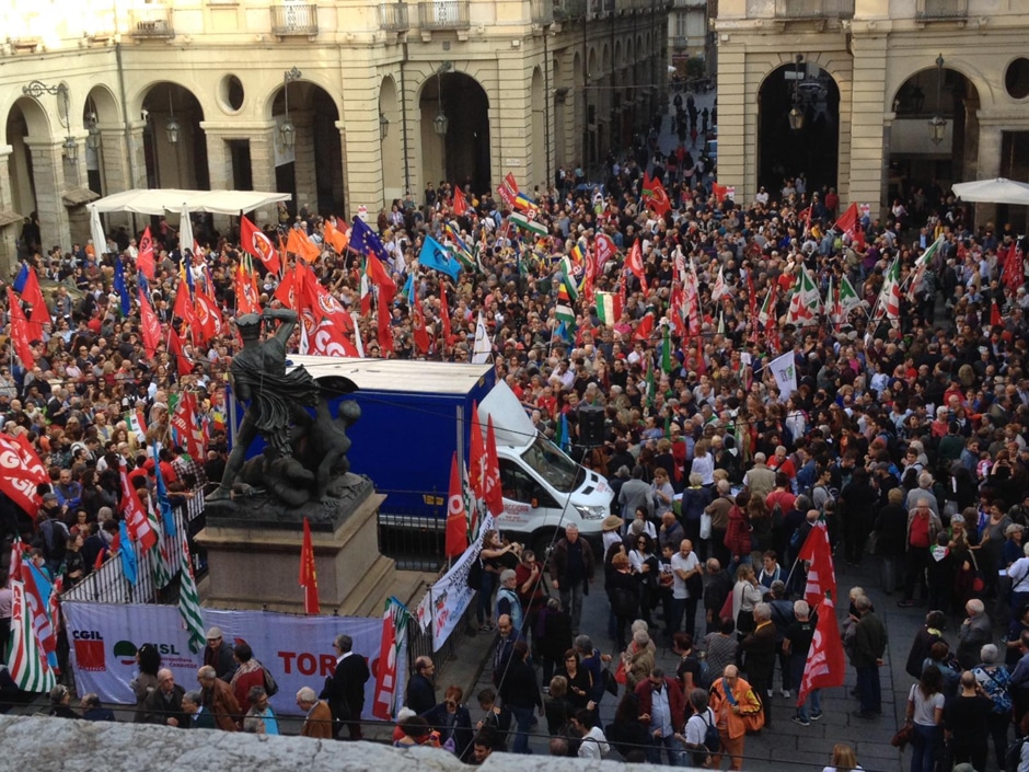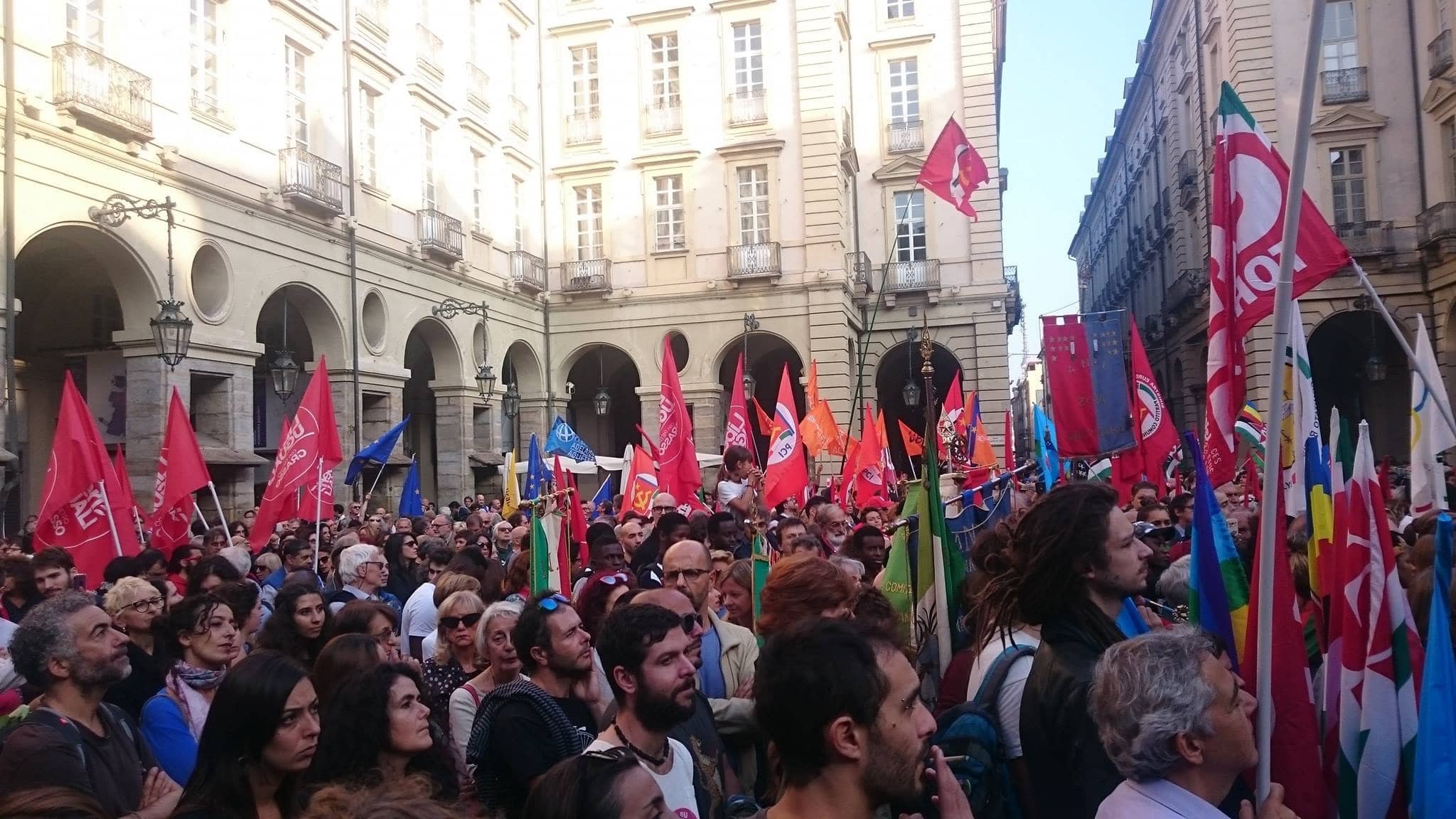 Sabato 20 ottobre una delle piazze auliche di Torino, davanti alla Casa del Comune, era gremita come da tempo non si vedeva per rispondere all’appello “Mai più fascismi-Restiamo umani”, lanciato da decine di organizzazioni: striscioni e vessilli dell’Anpi, bandiere di partiti diversi, di sindacati, di associazioni coloravano la giornata.