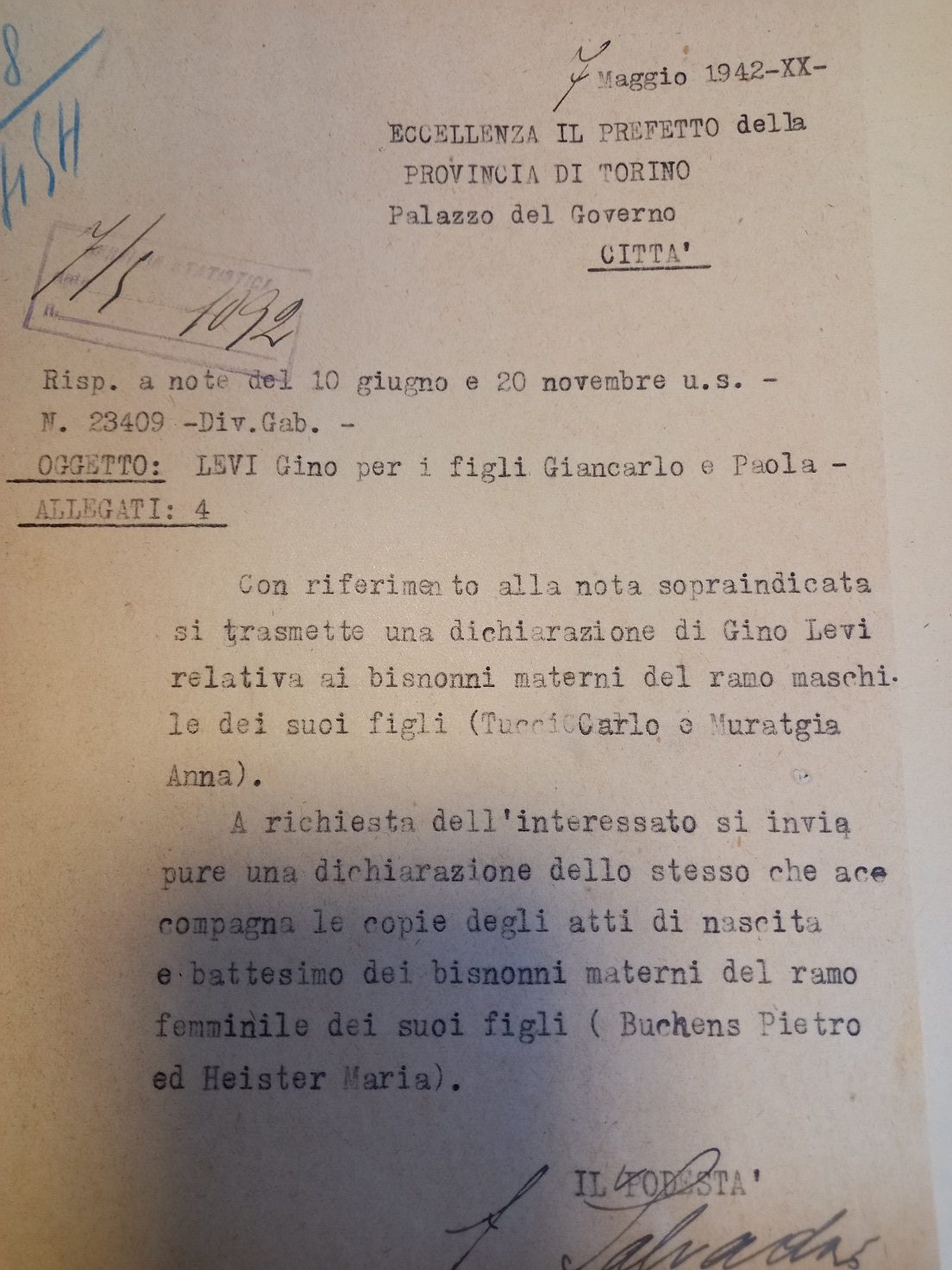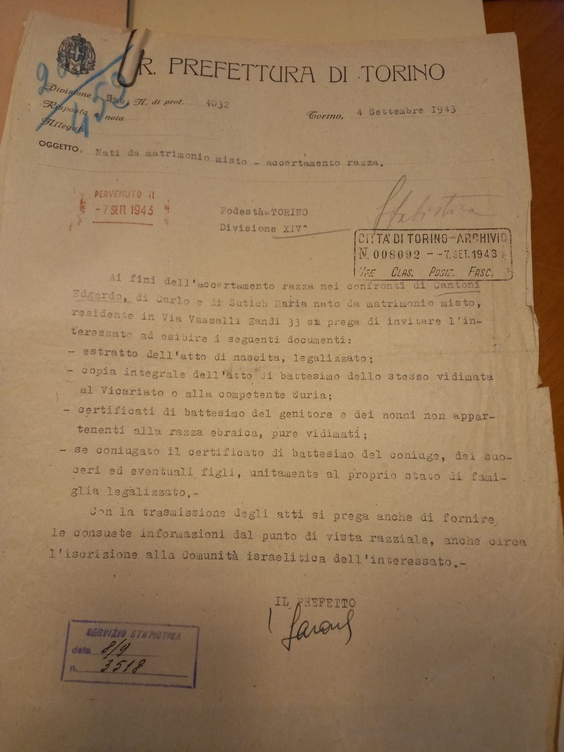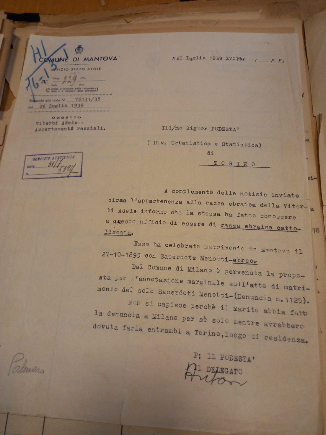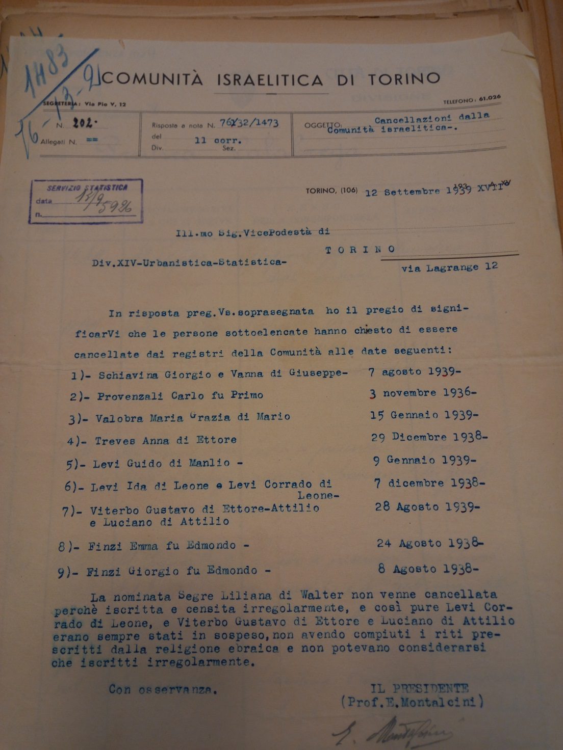 L’Archivio storico della Città di Torino ha 14 faldoni di lettere relative al censimento ebraico (Affari Divisione XIV, Urbanistica e statistica, classe 76, posizione 13): corrispondenza tra Prefettura e Podestà, richieste di accertamento razza da parte del Pnf, ospedali, Croce rossa italiana, Esercito, vari Comuni, aziende, banche, Ufficio lavori pubblici per qualsiasi lavoro edilizio, ecc. Poi nel corso degli anni occorre aggiornare sempre gli elenchi per cui il Podestà deve trasmettere al Prefetto le variazioni nella popolazione ebraica (nascite, morti, matrimoni, trasferimenti).