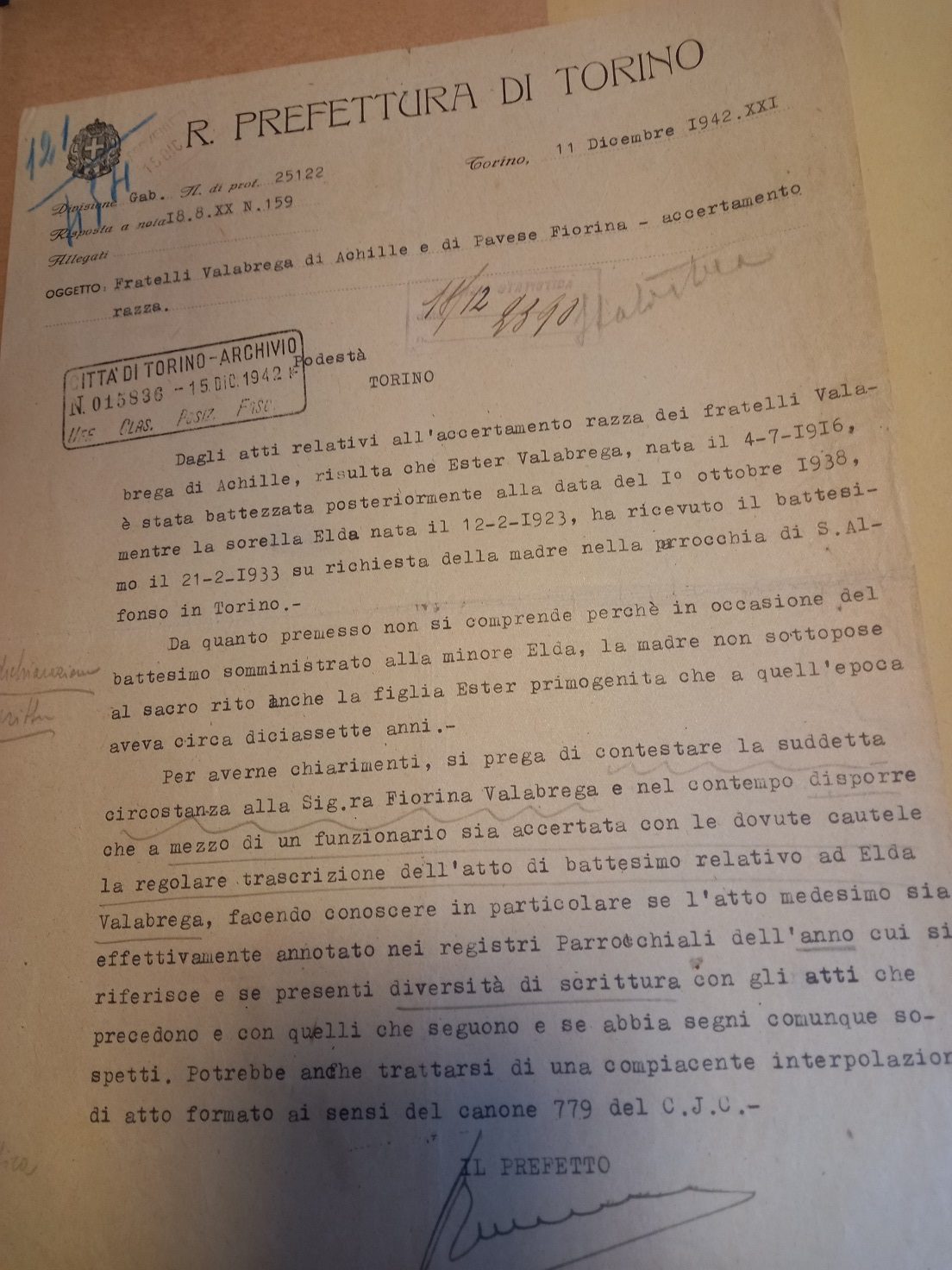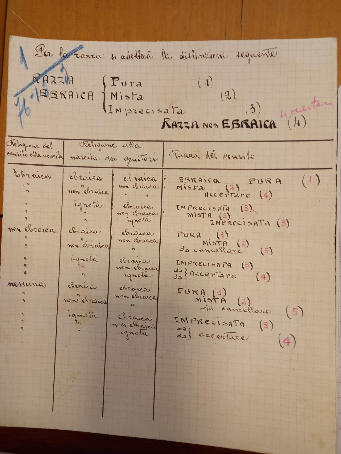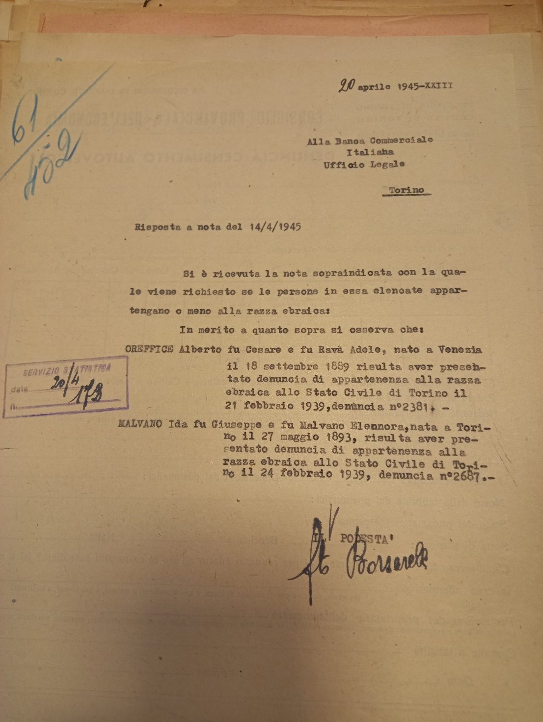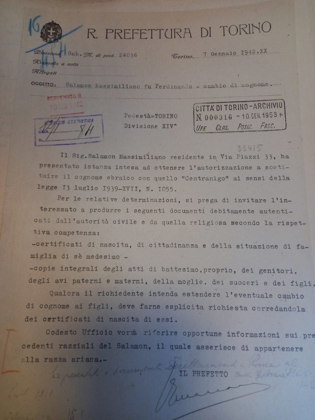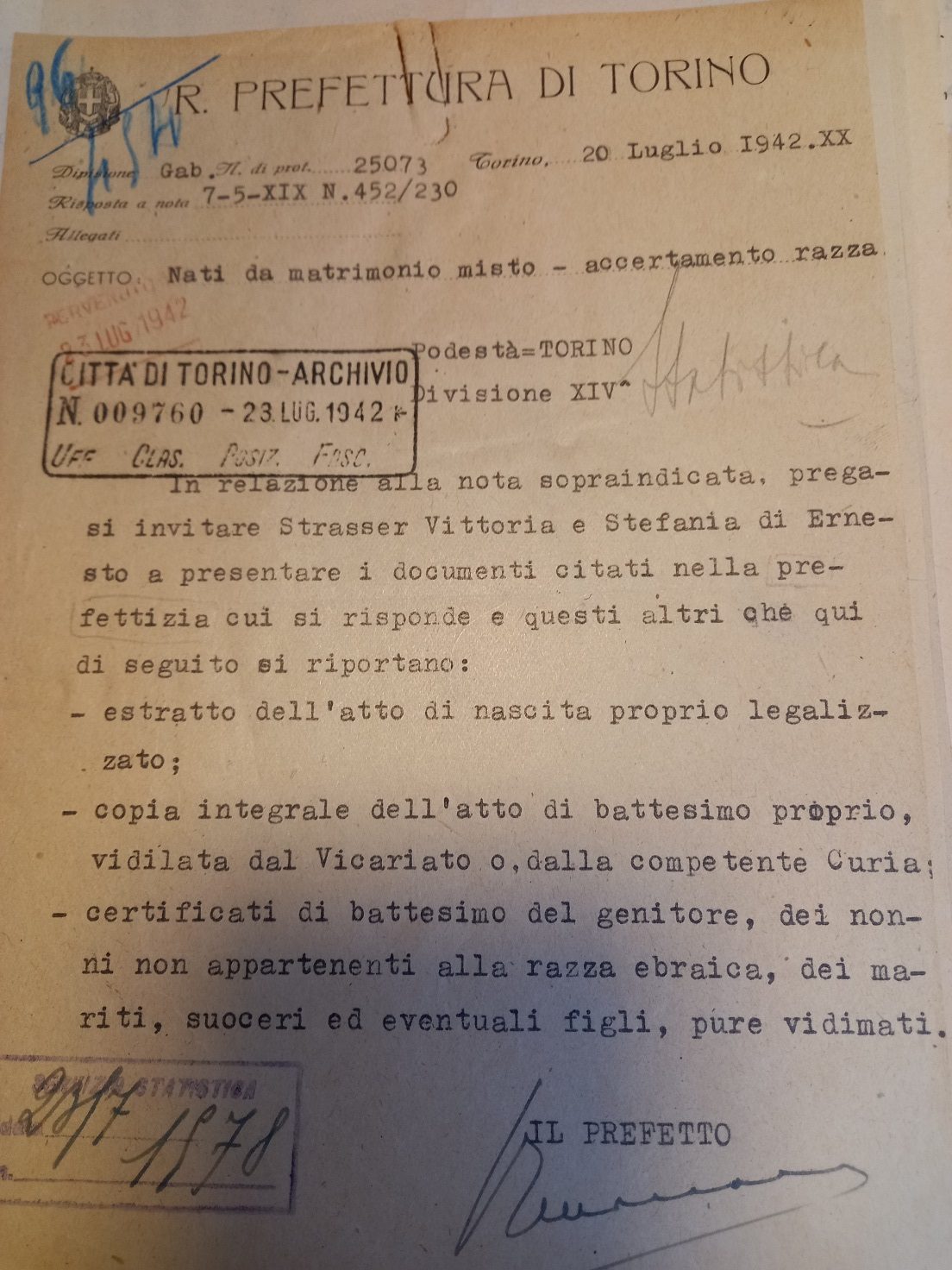 L’Archivio storico della Città di Torino ha 14 faldoni di lettere relative al censimento ebraico (Affari Divisione XIV, Urbanistica e statistica, classe 76, posizione 13): corrispondenza tra Prefettura e Podestà, richieste di accertamento razza da parte del Pnf, ospedali, Croce rossa italiana, Esercito, vari Comuni, aziende, banche, Ufficio lavori pubblici per qualsiasi lavoro edilizio, ecc. Poi nel corso degli anni occorre aggiornare sempre gli elenchi per cui il Podestà deve trasmettere al Prefetto le variazioni nella popolazione ebraica (nascite, morti, matrimoni, trasferimenti).