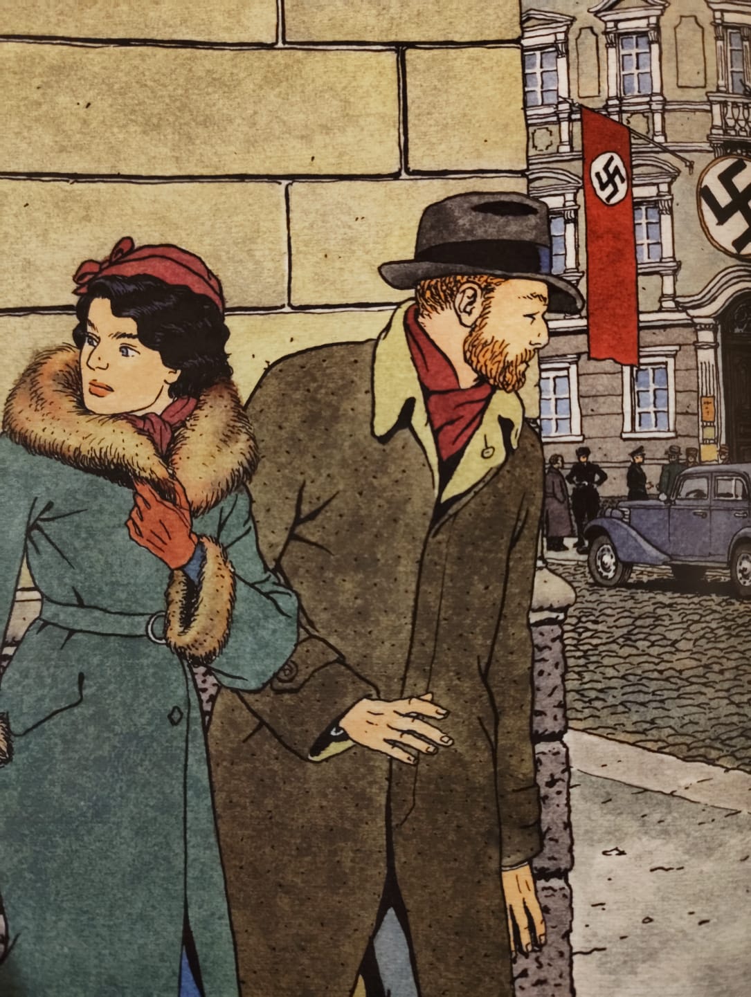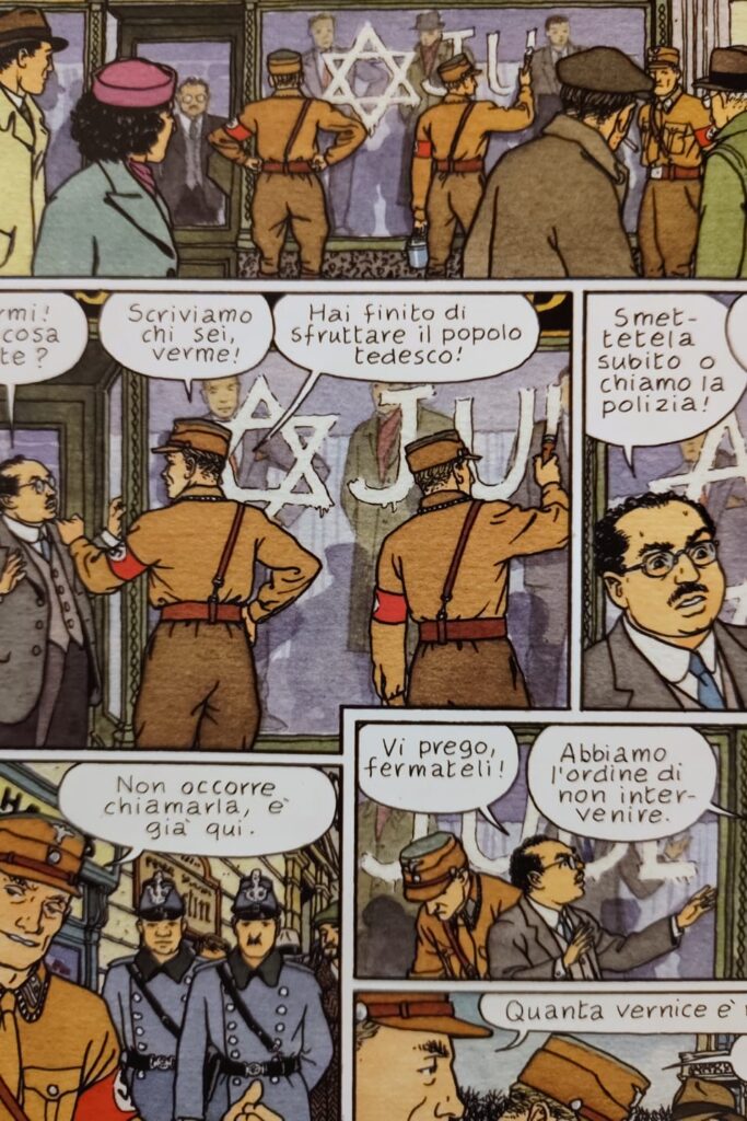 Il nuovo graphic novel si apre a Vienna, nell’aprile 1938, poche settimane dopo l’Anschluss. Al centro della vicenda vi è la famiglia Meyer, ebrei viennesi colti e ben integrati che dall’oggi al domani si ritrovano esclusi dalla società. L’intera prima metà dell’opera, con estrema cura storica, è dedicata al precipizio della discriminazione in cui piomba la quotidianità. Date, orari e scadenze compaiono spesso in didascalia, quasi a ricordarci che ogni giorno la morsa si stringe di più. Chi legge sa già che questo è un conto alla rovescia verso l’eliminazionismo, quel graduale trasformarsi di alcuni viennesi da persone comuni in fanatici persecutori esemplifica chiaramente la capacità massificante dell’ideologia nazionalsocialista.