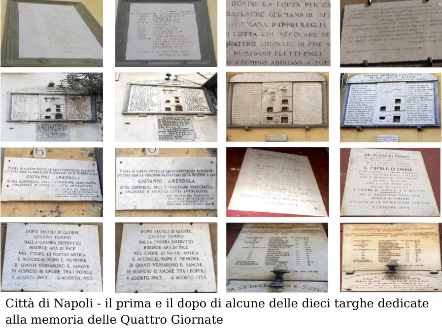 Ci conduce infine a Napoli, il viaggio dei restauri nel Paese che volle riscattarsi dall’ignominia nazifascista. Nella città delle Quattro giornate, MdO VM, ben dieci targhe nel centro abitato tornano a raccontare l’insurrezione popolare di donne e uomini che, tra il 27 e il 30 settembre 1943, cacciarono le forze tedesche della Wehrmacht appoggiate dai fascisti.