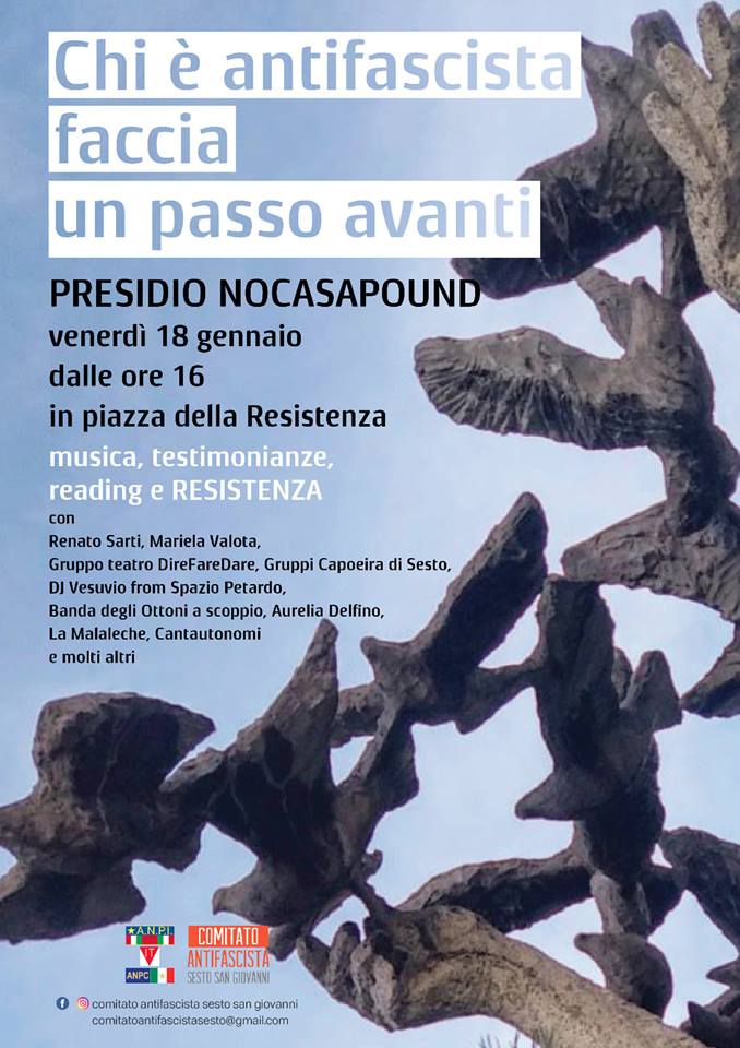 Ma gran parte dei cittadini ha scelto di reagire: il Comitato Antifascista si mobilita con un presidio il 14 gennaio in piazza IV Novembre e ancora il 18 in piazza della Resistenza con l’iniziativa “Chi è antifascista faccia un passo avanti” dove si esibiranno gruppi musicali, tra i quali la Banda degli Ottoni, e teatrali: “Sarà una grande festa della democrazia in piazza della Resistenza, cuore e centro della nostra città – spiegano i promotori – dove le forze antifasciste di Sesto vogliono portare oltre che testimonianza anche teatro, musica e allegria. Le arti sono ponti e noi abbiamo bisogno oggi di essere una comunità che, nelle sue differenze, apre vie e strade per stare insieme nei valori che ci tengono uniti”. E sta raccogliendo sempre più adesioni su change.org la petizione “Chiediamo con convinzione di non concedere spazi pubblici ai fascisti del terzo millennio”. Intanto una richiesta formale è già stata inoltrata al sindaco Di Stefano, al questore di Milano Cardona e al prefetto Saccone.