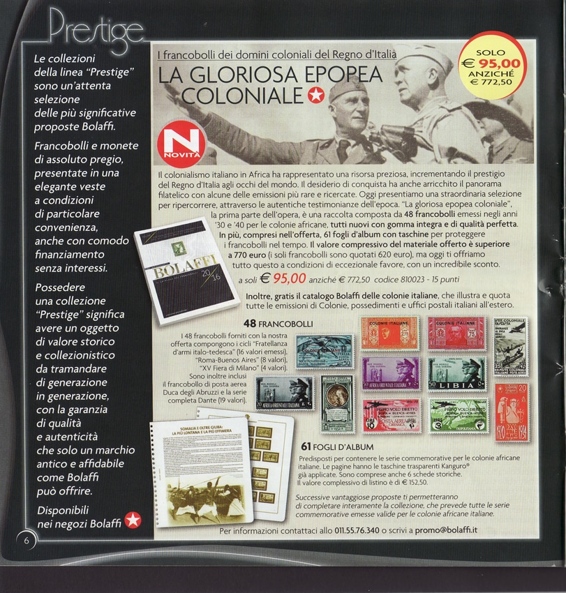 Cosa c’entra la filatelia con il panegirico del colonialismo italiano? C’è una risposta sul catalogo “Collector Club” (II semestre 2018). Il catalogo è un veicolo che pubblicizza la vendita di collezioni di francobolli e di monete a prezzi scontati. E vi si trova di tutto: dai francobolli su David Bowie a quelli sui treni a quelli su Papa Wojtyla. Nulla di strano. Senonché a pagina 6, ove si presentano le collezioni della linea “Prestige” che “sono un’attenta selezione delle più significative proposte Bolaffi”, campeggia, corredato da una foto di Graziani con Badoglio, il titolo (tutto in maiuscolo) “La gloriosa epopea coloniale”, che è anche il nome della raccolta di francobolli. Sotto il titolo, la presentazione: “Il colonialismo italiano in Africa ha rappresentato una risorsa preziosa, incrementando il prestigio del Regno d’Italia agli occhi del mondo. Il desiderio di conquista ha anche arricchito il panorama filatelico con alcune delle emissioni più rare e ricercate”.