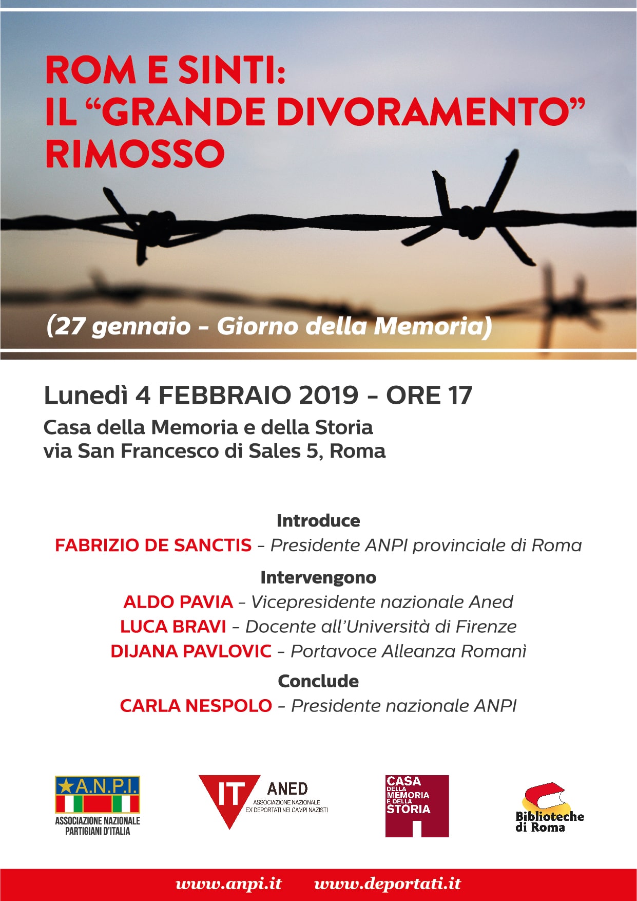 L’Anpi nazionale e l’Aned nazionale, in occasione del Giorno della Memoria, hanno deciso di dar vita ad un’iniziativa che approfondisca il tema del Porrajmos, per riportare davanti all’opinione pubblica uno dei più grandi crimini contro l’umanità perpetrato dalla bestia nazista. Alle 17 di lunedì 4 febbraio, alla Casa della Memoria e della Storia in via San Francesco di Sales 5 a Roma si parlerà di questo; il convegno ha come titolo “Rom e Sinti: il “Grande Divoramento” rimosso”. Ne parleranno Fabrizio de Sanctis, Aldo Pavia, Luca Bravi, Dijana Pavlovic; concluderà Carla Nespolo.