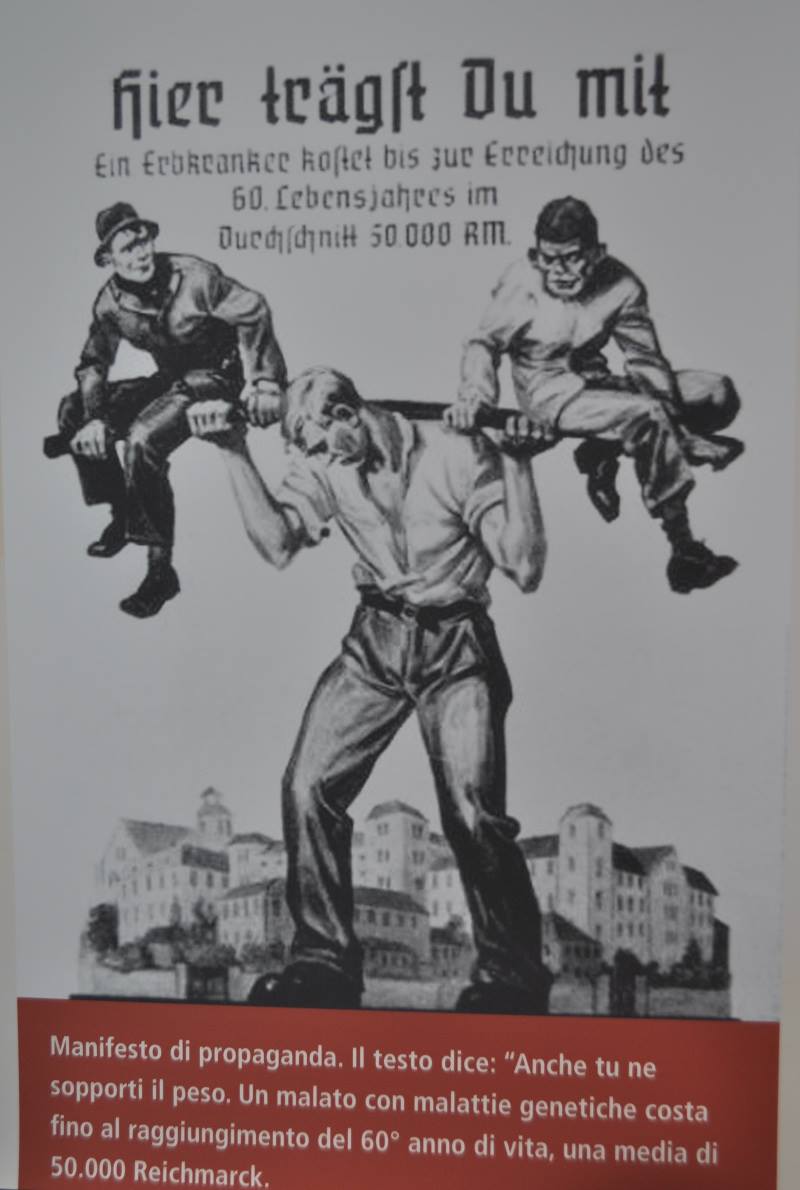 I malati mentali e psichici rappresentavano un grave peso durante il nazismo che, tra il 1933 e il 1939, decise di sterilizzare 400mila persone contro la loro volontà. La mostra contiene 50 pannelli fotografici di persone comuni che avevano “la colpa” di essere affetti da problemi psichiatrici. Nell’autunno del 1939, per ordine di Hitler, veniva perseguito un feroce e sistematico programma contro quanti erano marchiati da “inferiorità mentale” perché portatori di “difetti genetici”: l’Aktion T4, nome convenzionale del “Programma nazista di eutanasia”. T4 è l’indirizzo, via e numero civico, di Berlino dove era situato il quartier generale dell’ente pubblico per la salute e l’assistenza sociale. Il piano di eugenetica razziale perseguito dal nazismo è stato una delle più feroci e indicibili forme di eliminazione fisica al fine di preservare la purezza del popolo tedesco.