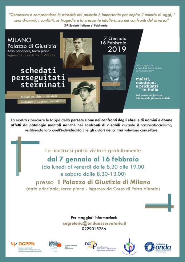 Sarà a Milano, a partire dal 7 gennaio e fino al 16 febbraio nei locali del Palazzo di Giustizia, la mostra “Schedati, perseguitati, sterminati. Malati psichici e disabili durante il nazionalsocialismo”, un’esposizione itinerante, visitabile gratuitamente, realizzata dalla Società italiana di Psichiatria in collaborazione con il Network europeo per la ricerca e la formazione in psichiatria e psicodinamicità e, nel capoluogo lombardo, dall’Osservatorio nazionale sulla salute della donna e di genere (Onda). La mostra è partita nel gennaio 2014 nel Parlamento tedesco a Berlino e, significativa fin dal titolo, dopo alcune soste in diverse città europee (Vienna, Londra, Osaka) e italiane (Roma, tra le altre) con oltre 340 mila fruitori, ha fatto tappa nel mese di novembre anche alla Cittadella dei Musei di Cagliari, con il patrocinio dell’Università e dell’Azienda ospedaliero-universitaria di Cagliari.