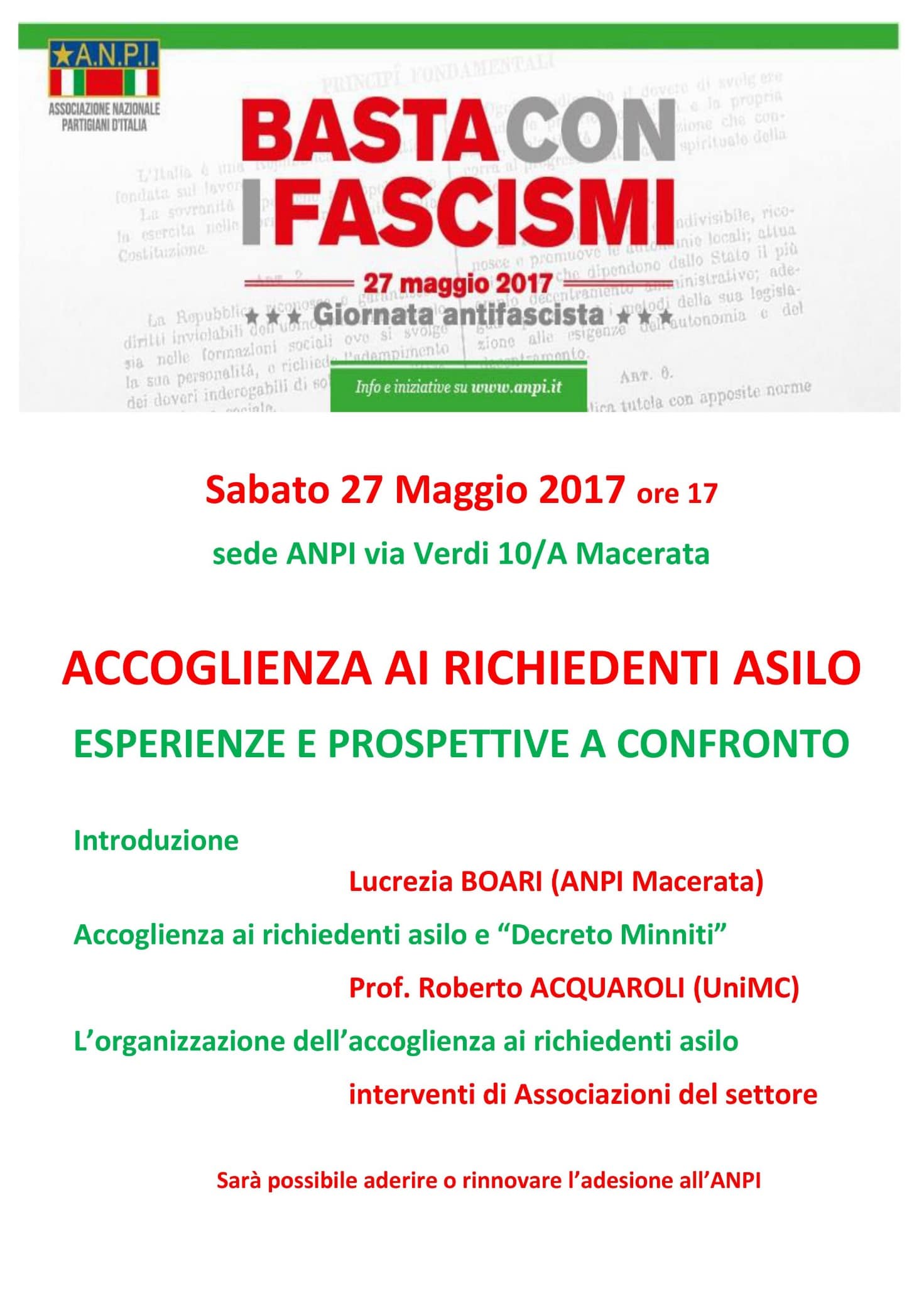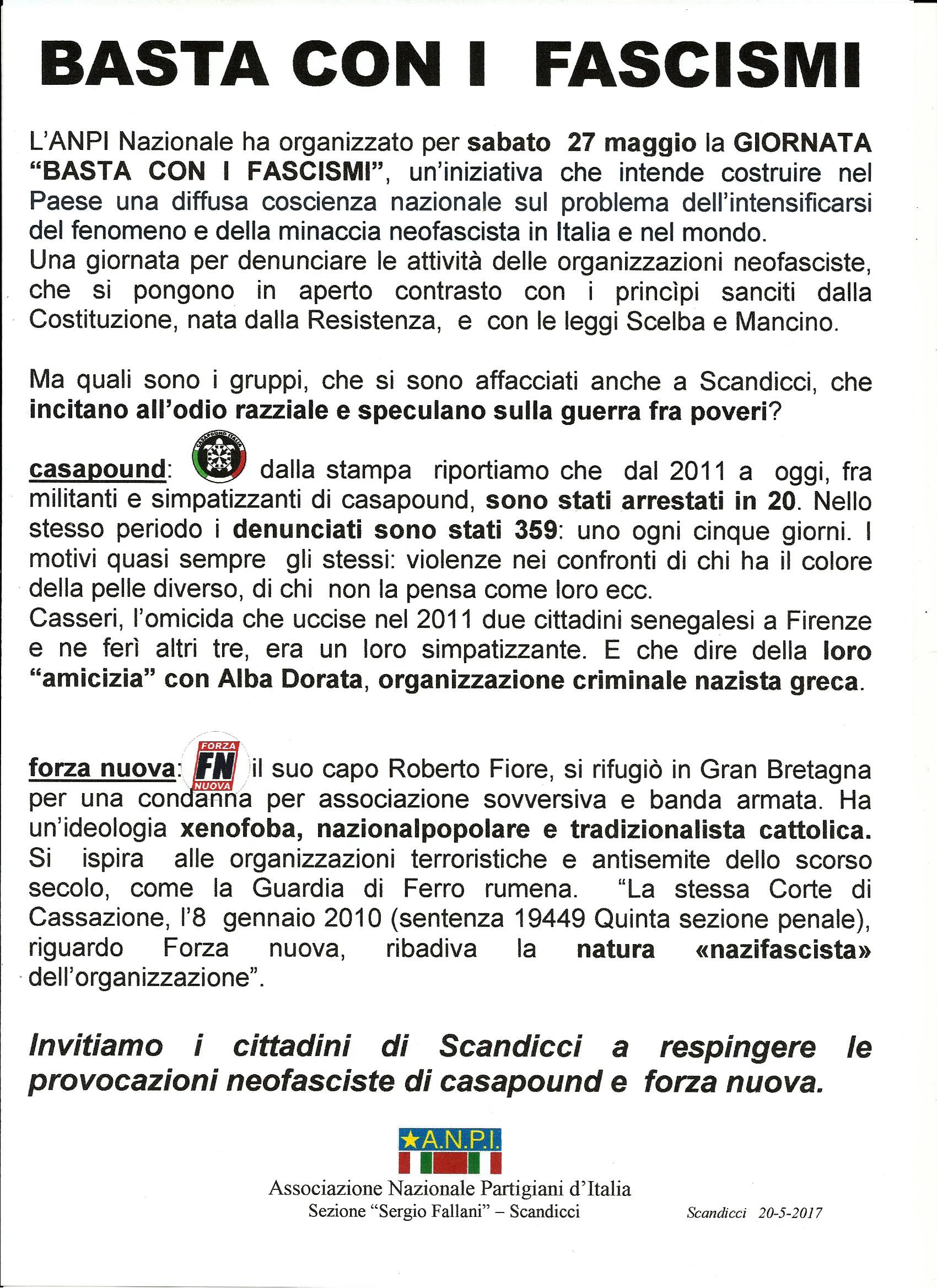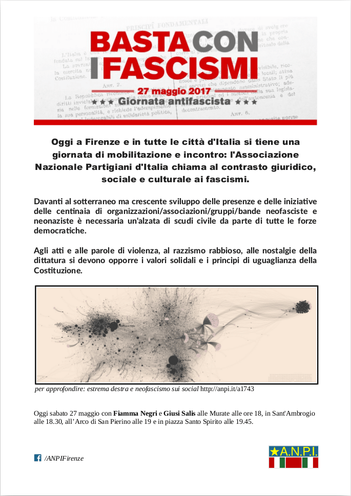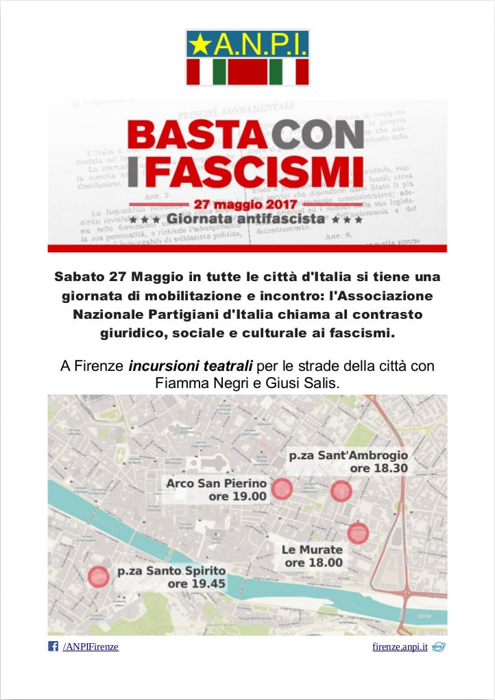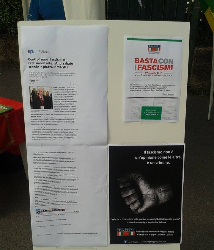 Non ci si stupisca, dunque, che qui ed ora noi oggi proponiamo ai visitatori l’illustrazione di una giornata speciale, questo nostro 27 maggio 2017, che l’ANPI ha dedicato alla lotta contro ogni fascismo. In altri articoli di questo numero si trova un’ampia cronaca di ciò che è avvenuto di fatto in tutta Italia. In altri ancora si può leggere sull’andamento del seminario nazionale promosso sempre dall’ANPI a Roma nello stesso giorno sullo stesso tema.