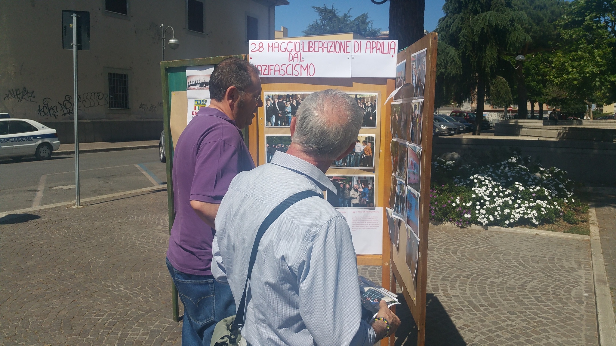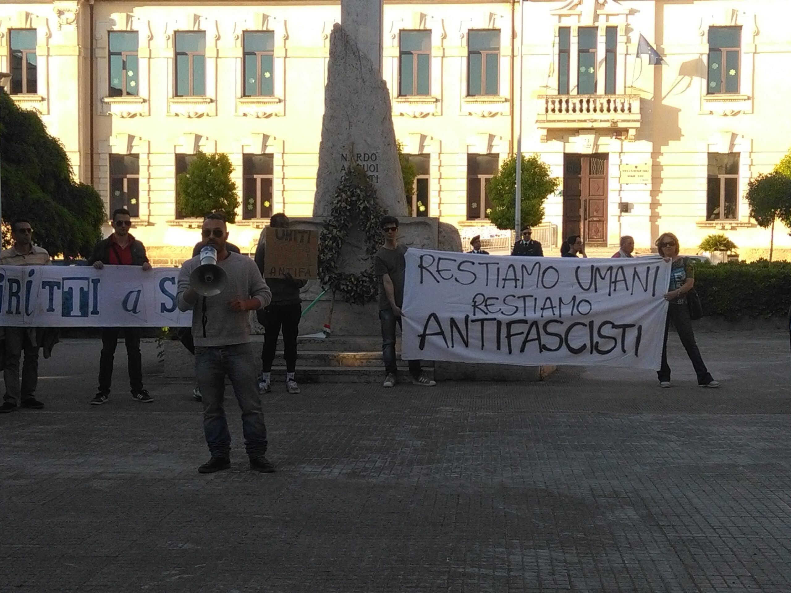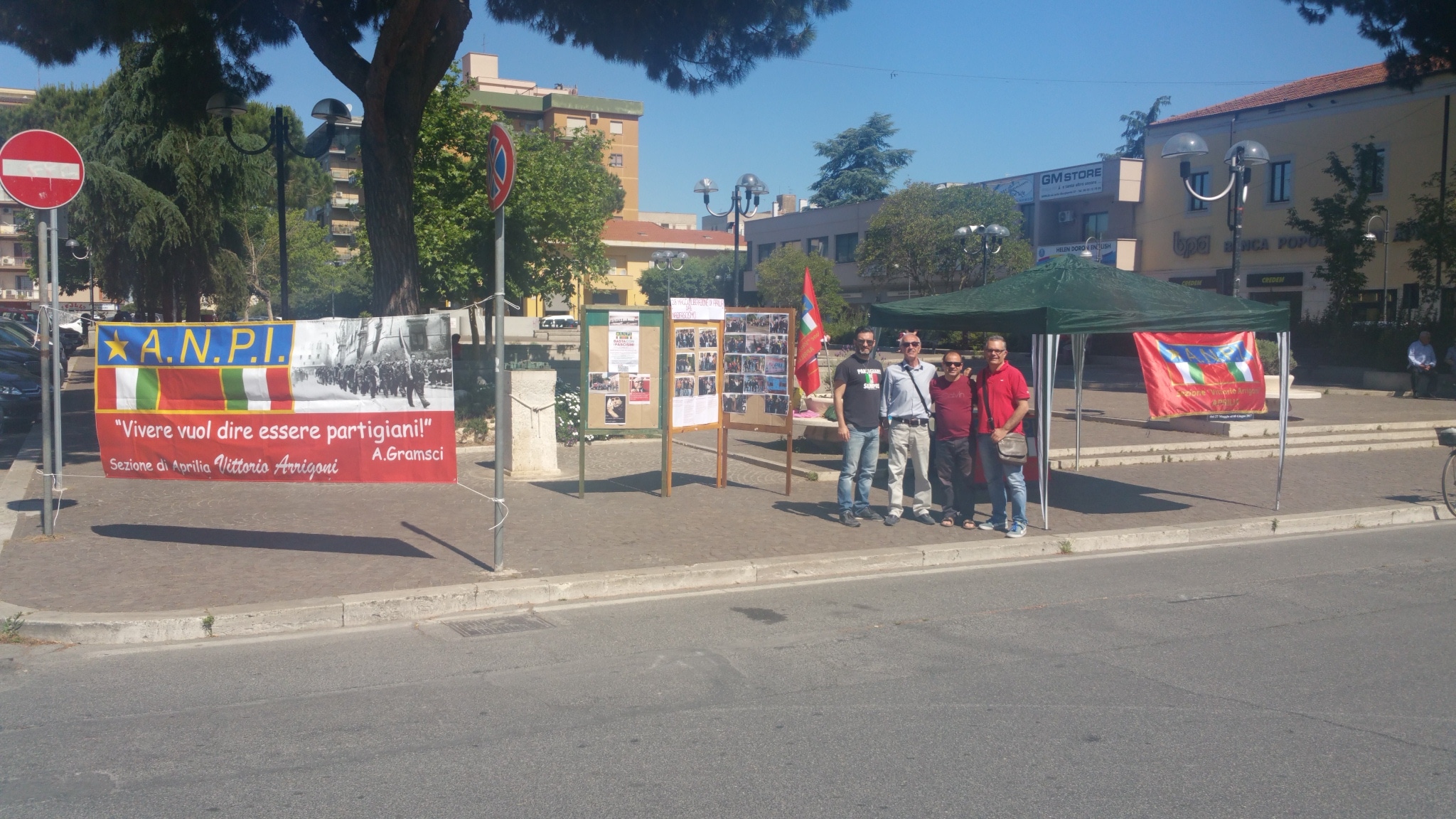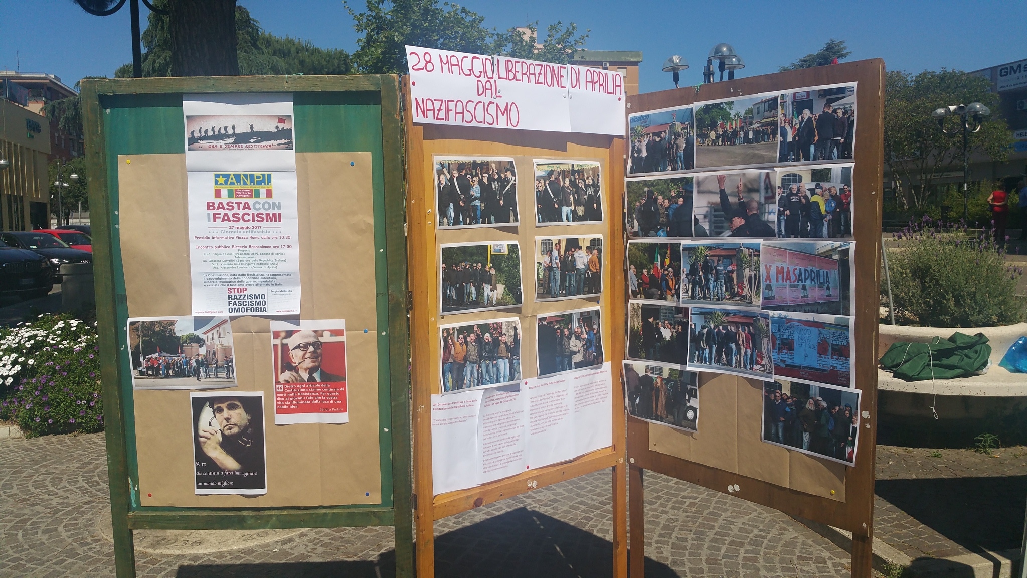 Un presidio in piazza Roma al mattino con gazebo informativo e una mostra su pannelli sui fascismi moderni: molte foto documentano la provocatoria commemorazione fascista che avviene ogni 25 Aprile al cippo di Campoverde (frazione di Aprilia), eretto in memoria della brigata Barbarigo della X Mas