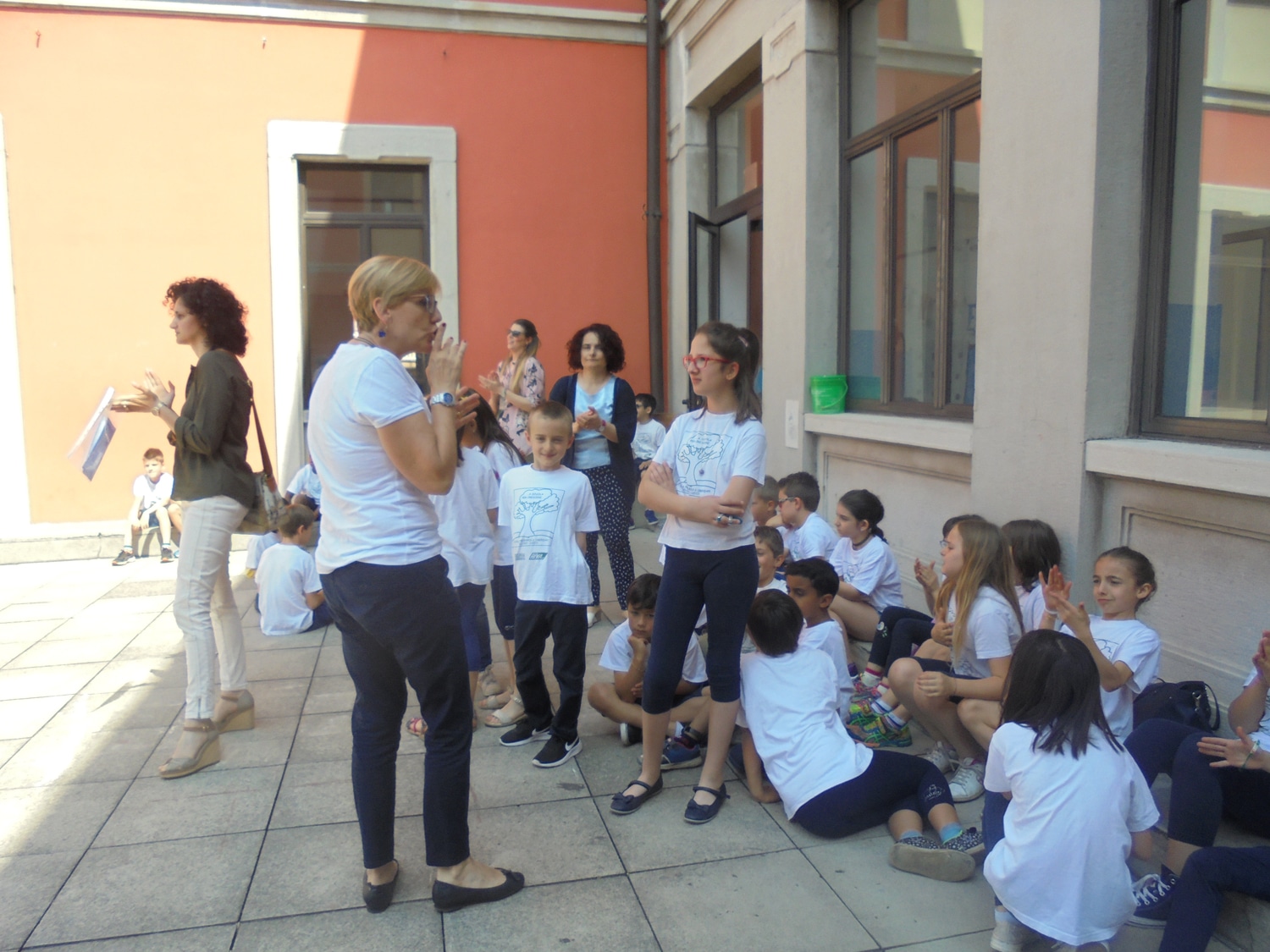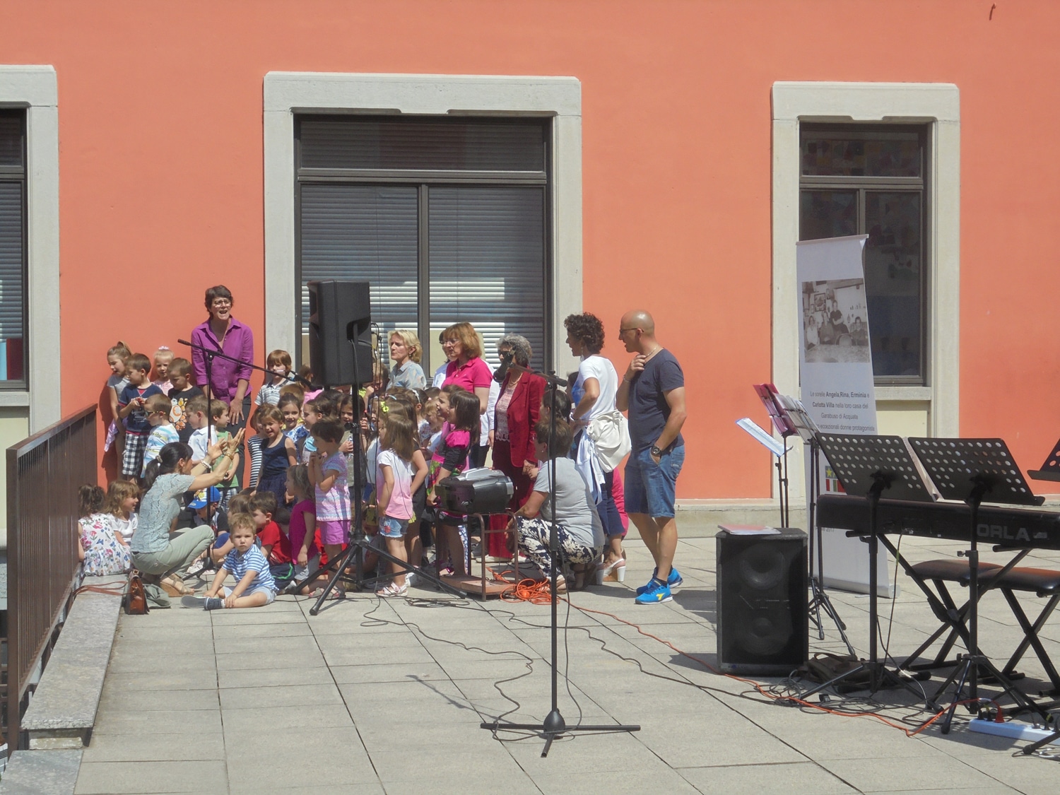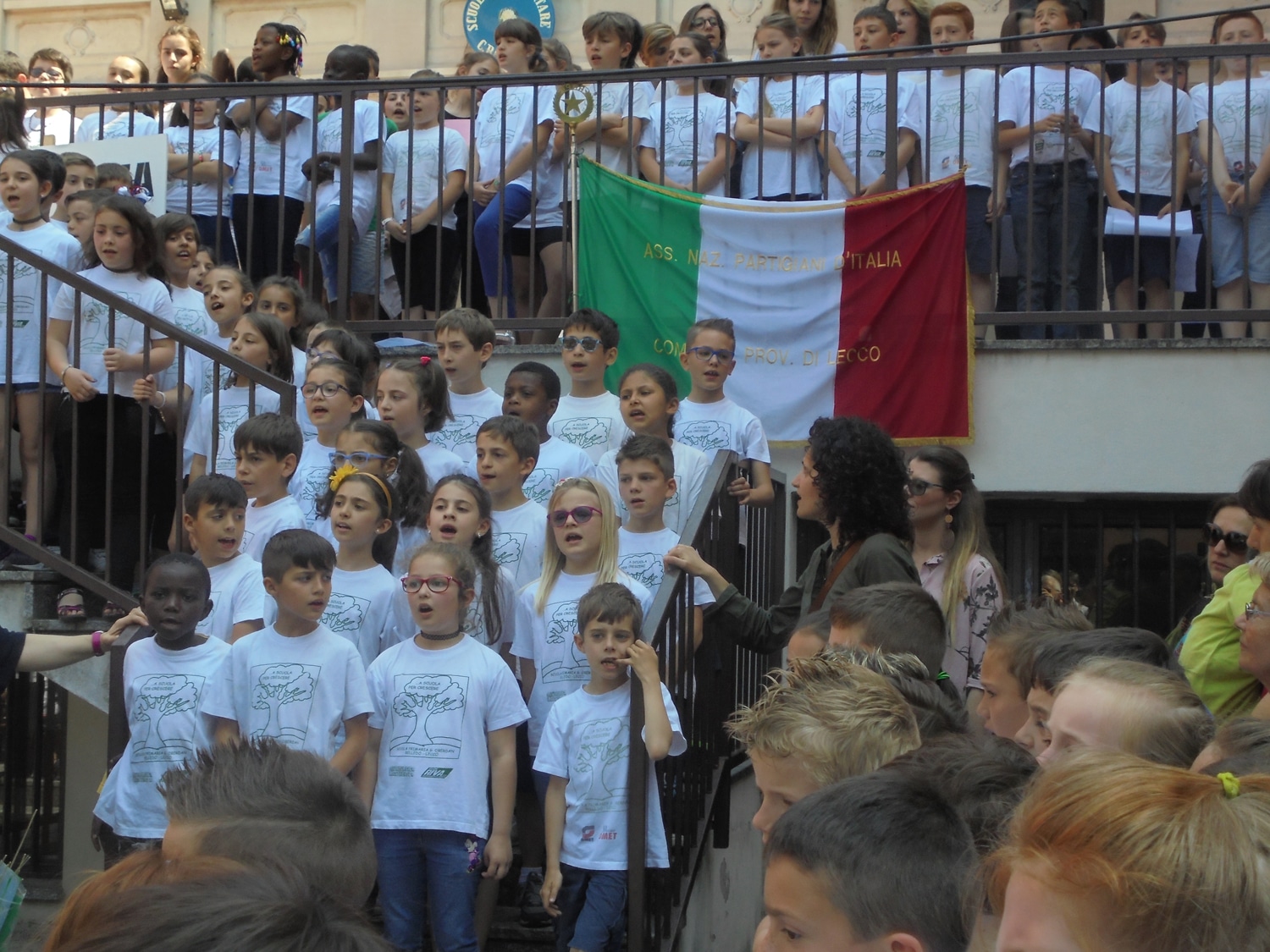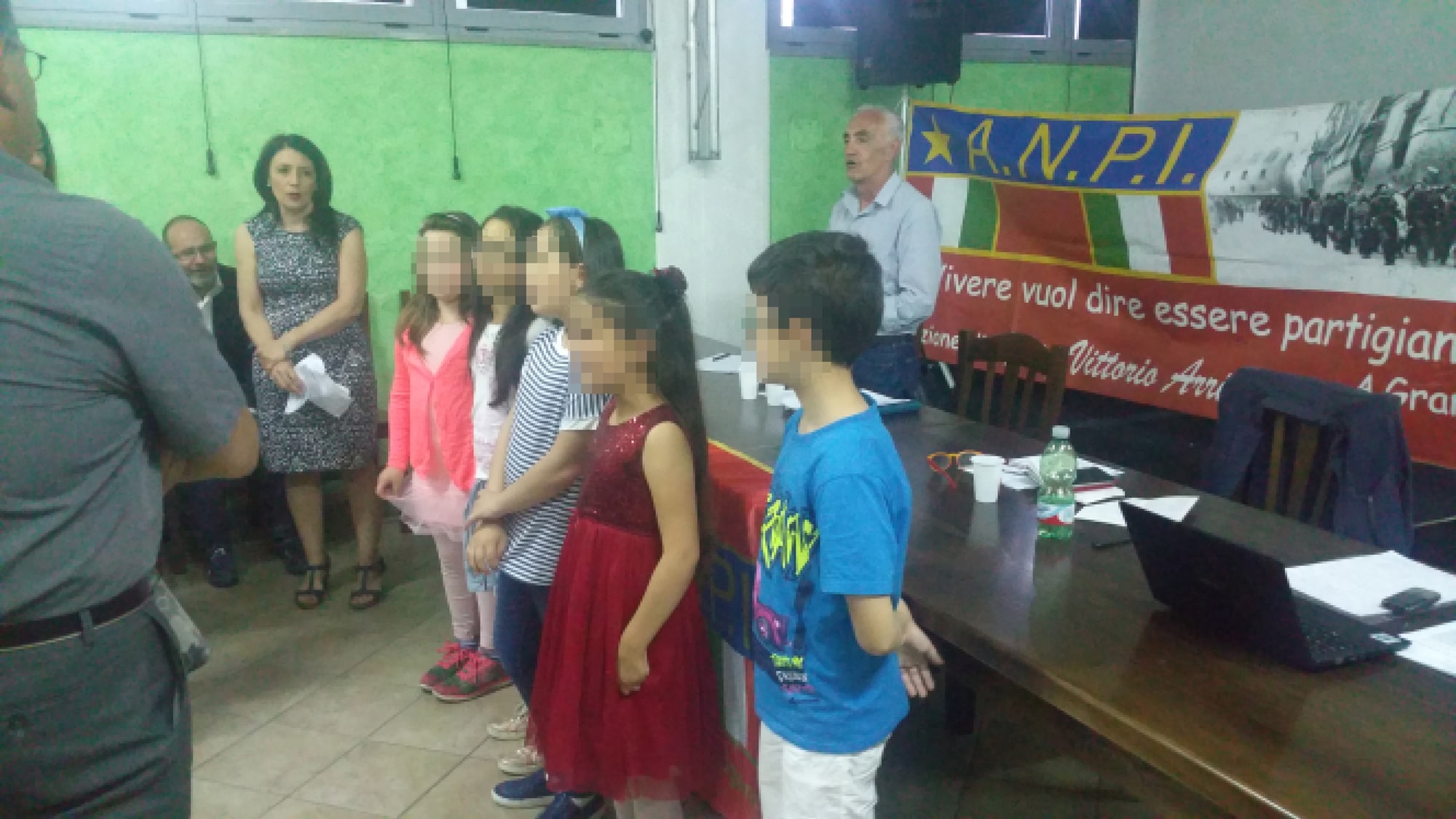 Un bel momento dell’iniziativa con gli alunni di una terza elementare, guidati dalla maestra Menita Carozza, iscritta all’ANPI, che hanno recitato una storia partigiana e cantato “Bella ciao” a cappella