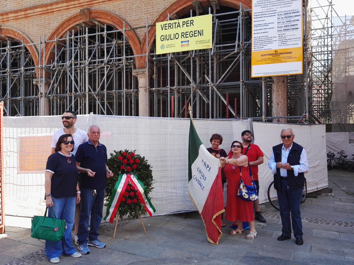 A Mirandola, nella bassa modenese, deposizione di una corona al Sacrario ai Caduti della Resistenza, ancora inaccessibile dopo il terremoto, da dove è partita la passeggiata sui luoghi del fascismo e della Resistenza