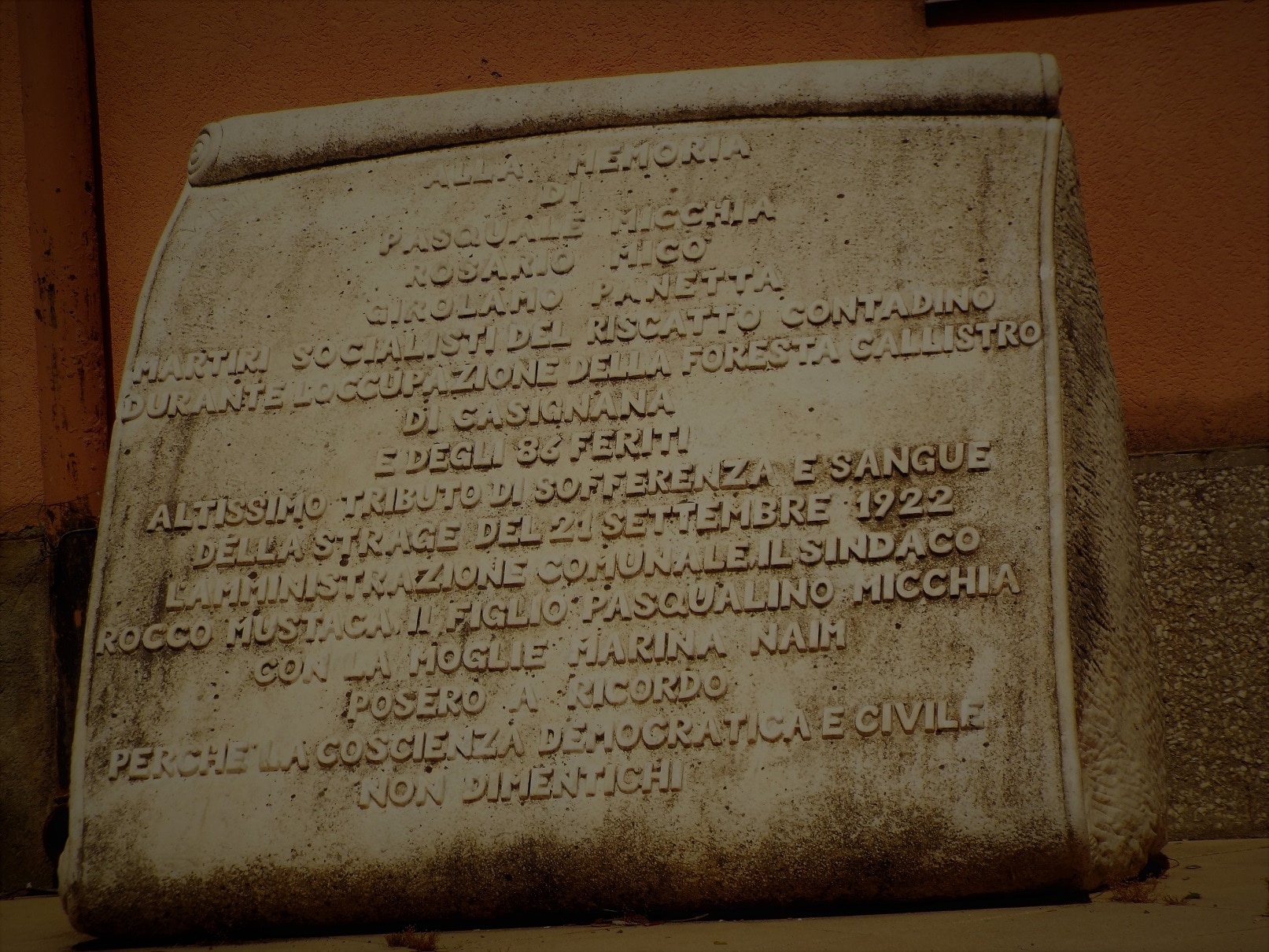 Casignana, lapide in memoria della strage del settembre 1922. I fascisti spararono sui contadini e sul sindaco uccidendo 3 persone e ferendo decine e decine di persone. Giuseppe Bottai si recò nella località calabrese per complimentarsi con gli squadristi locali.