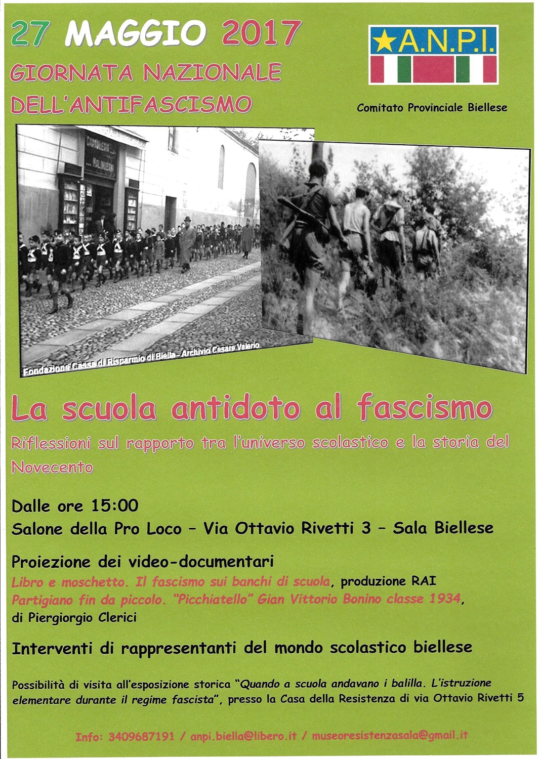 Casa della Resistenza di Sala Biellese, è stata allestita a cura della locale sezione ANPI la mostra “Quando a scuola andavano i balilla. L’istruzione elementare durante il regime fascista” con esposizione di libri, quaderni, pagelle originali del Ventennio, che ruotano intorno ad un vecchio banco di legno, generando gradevole sorpresa nei più giovani visitatori e un moto di nostalgia nei più anziani