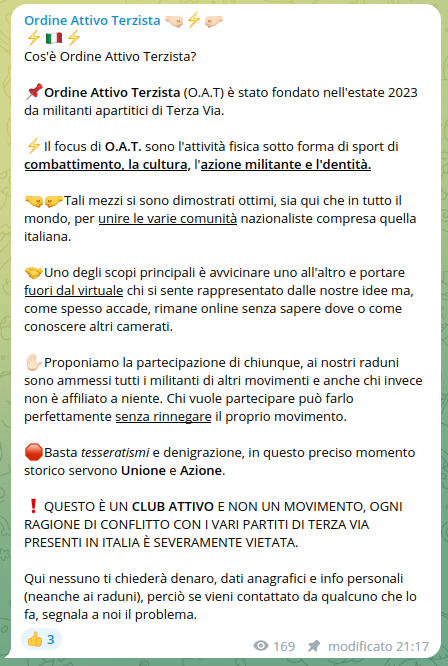 Negli ultimi giorni di agosto è stato annunciato quello che di fatto è il primo Active club in Italia, il club attivo Ordine Attivo Terzista.