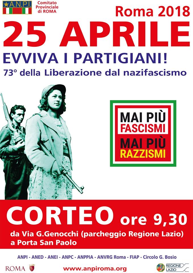 APPUNTAMENTO PER TUTTI GLI ANTIFASCISTI IL 25 APRILE 2018 ALLE ORE 9,30 A VIA G. GENOCCHI (PARCHEGGIO REGIONE LAZIO), PER UN CORTEO CHE SI SNODERÀ TRA I QUARTIERI DI GARBATELLA E OSTIENSE PER RAGGIUNGERE PORTA SAN PAOLO, DOVE CON LE ASSOCIAZIONI DELLA RESISTENZA E DELLA GUERRA DI LIBERAZIONE SARANNO LE ISTITUZIONI A RIBADIRE LA NATURA ANTIFASCISTA DELLO STATO ITALIANO