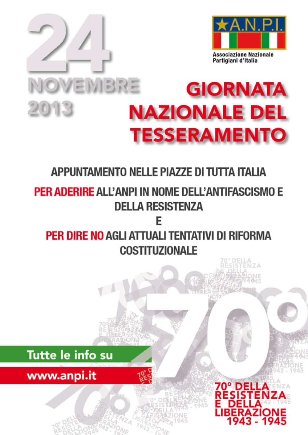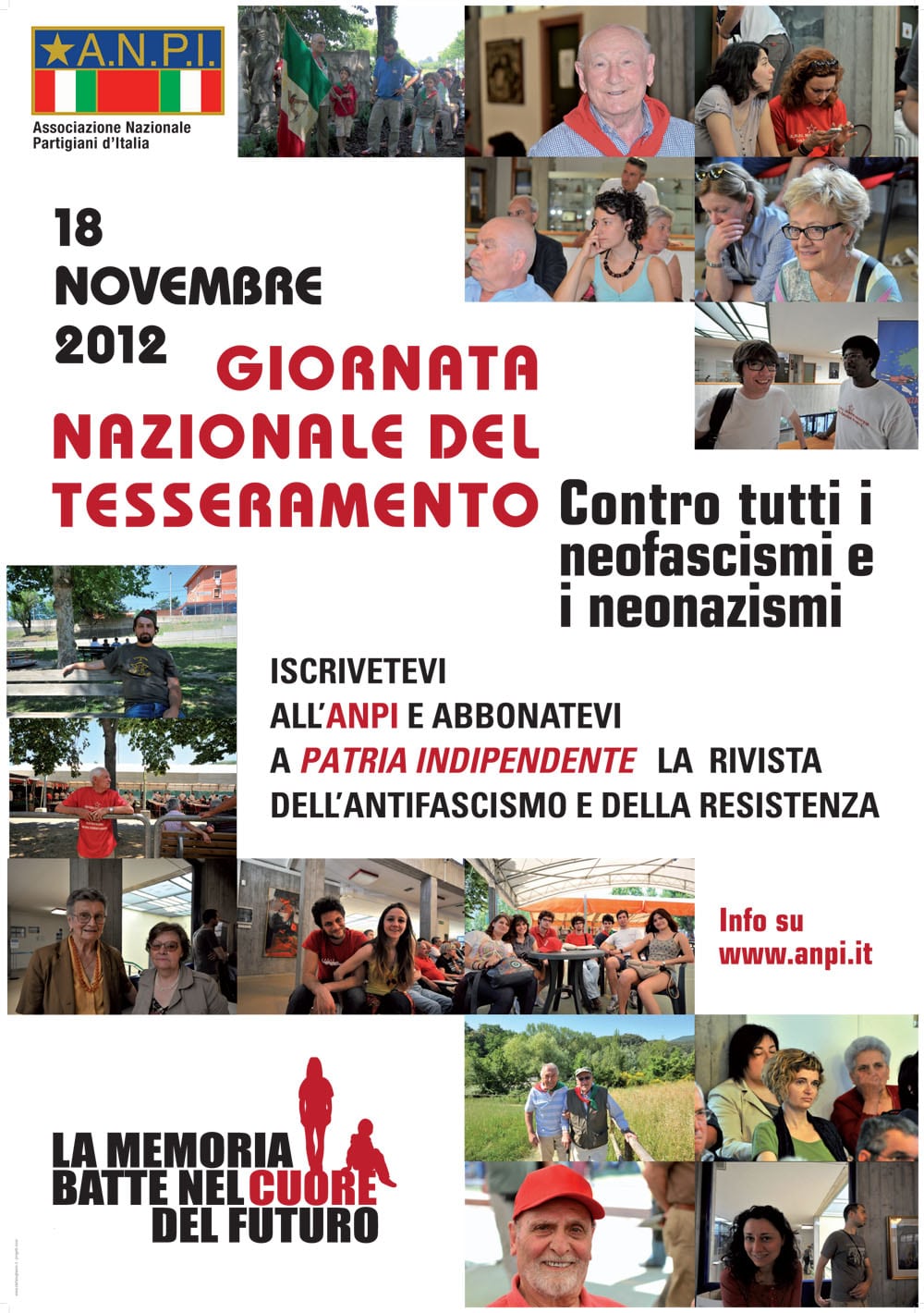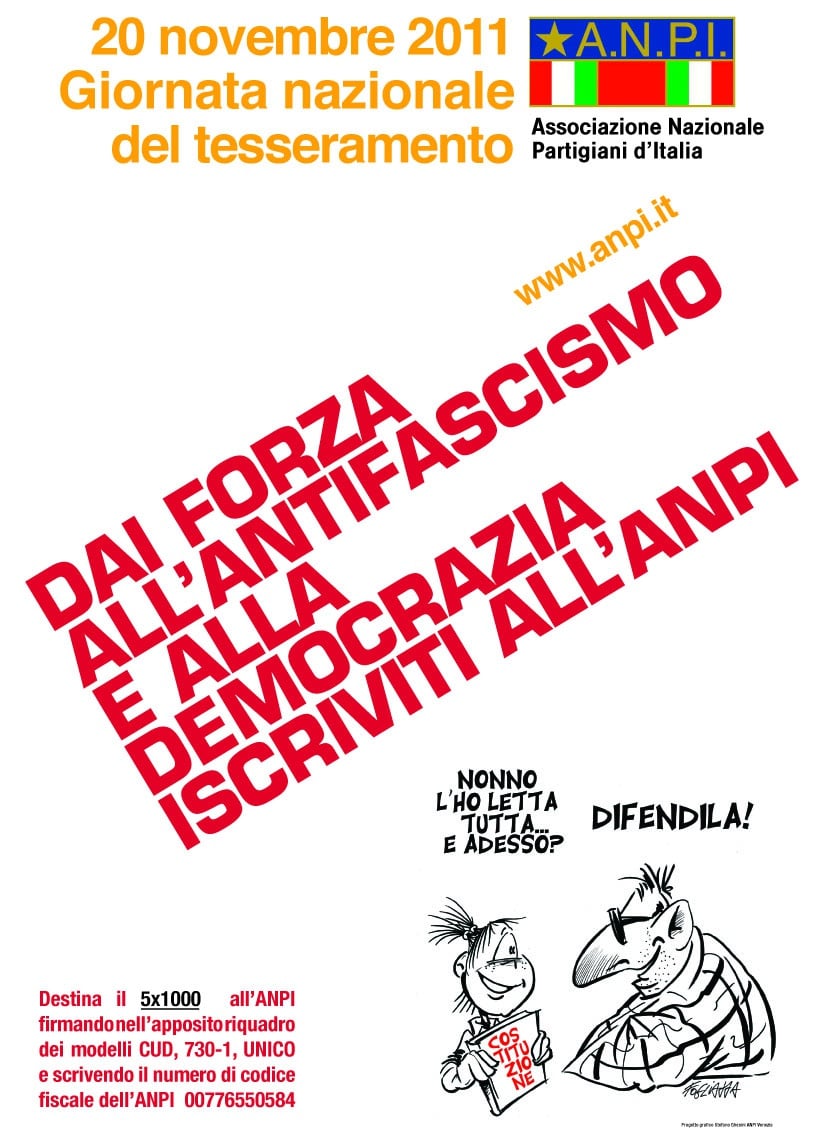 Anche nel 2015 l’ANPI sarà presente in tante piazze d’Italia per la sua Giornata nazionale del tesseramento. Domenica 29 novembre sarà quindi possibile incontrare partigiani e antifascisti, conoscere iniziative, confrontarsi su democrazia e futuro, respirare una boccata d’aria costituzionale. Quindi, aderire all’Associazione, per i più volenterosi e desiderosi di appartenere ad un’antica, “ma sempre verde”, forza delle radici. Si tratta quest’anno della quinta edizione della giornata che ha visto, nel tempo, una partecipazione delle cittadine e dei cittadini sempre crescente. L’anno scorso si è raggiunto il picco di oltre 160 piazze con una importante attenzione dei media. Un appuntamento che è anche un richiamo a vivere con coscienza, speranza, e voglia di contribuire con idee e passione, il proprio Paese. Dettagli sulle località e gli orari sono disponibili su www.anpi.it.