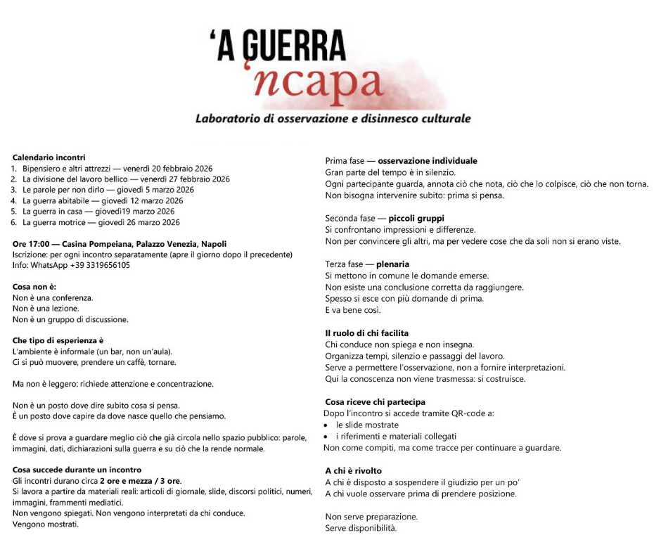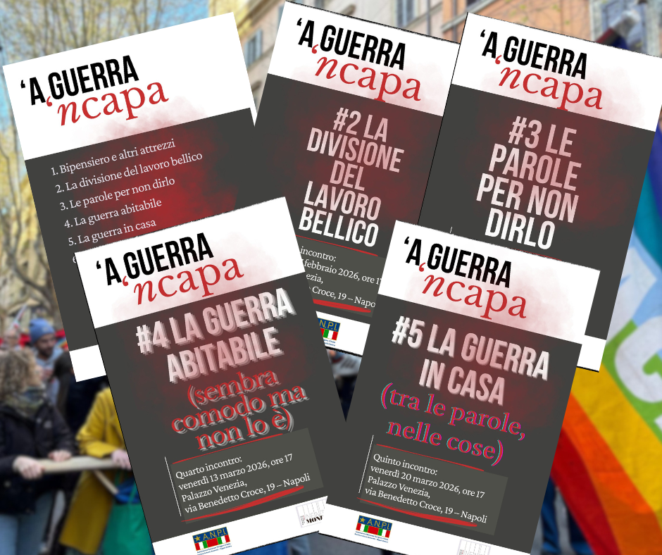 Il laboratorio ‘A Guerra ‘ncapa deriva da un’idea di Davide Borrelli, sviluppata nel metodo e nei contenuti da Marialuisa Stazio. Entrambi sono sociologi dei processi culturali e comunicativi. Info e iscrizioni: WhatsApp +39 331 9656105 — Casina Pompeiana, Palazzo Venezia, via Benedetto Croce 19, Napoli — Ogni incontro è autonomo; le iscrizioni per ciascun appuntamento aprono il giorno successivo all’incontro precedente. Prossimi appuntamenti: 3 aprile (La guerra motrice) e 10 aprile (Cecità). Patrocinato dalla Sezione ANPI Napoli Centro “Antonio Amoretti” e dalla rivista Infiniti Mondi.