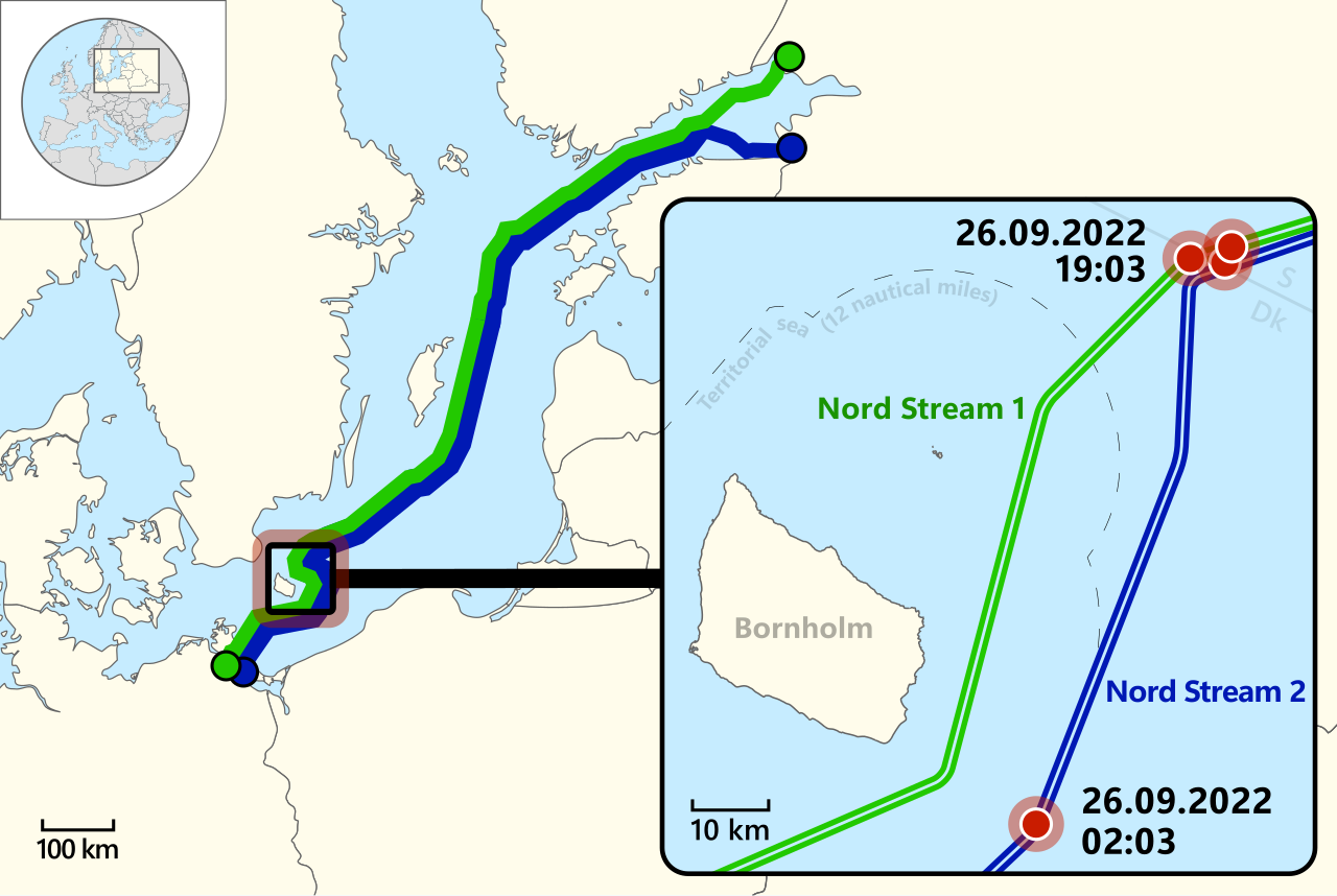 2) Possiamo anche partire dalla traiettoria dell’Europa, come elemento incomodo in questo scenario di fragili equilibri internazionali, falciata nel suo cammino (impervio e pieno di tante contraddizioni) includente verso est, verso la Russia addirittura. Il sabotaggio del North Stream nel Mare del Nord, da parte di agenti ucraini probabilmente supportati da apparati USA, rappresenta emblematicamente un trauma doloroso che spezza la continuità di un corpo territoriale; possiamo immaginarlo come la rescissione di un’arteria nel corpo geografico dell’EuroRussia. Del resto, a parte le traiettorie della storia recente e passata, una carta geografica è sufficiente a rappresentare questa continuità che ha allarmato la costa ovest dell’Atlantico e che vedeva nella Germania, e dunque nell’Europa, il punto fondamentale di accumulo