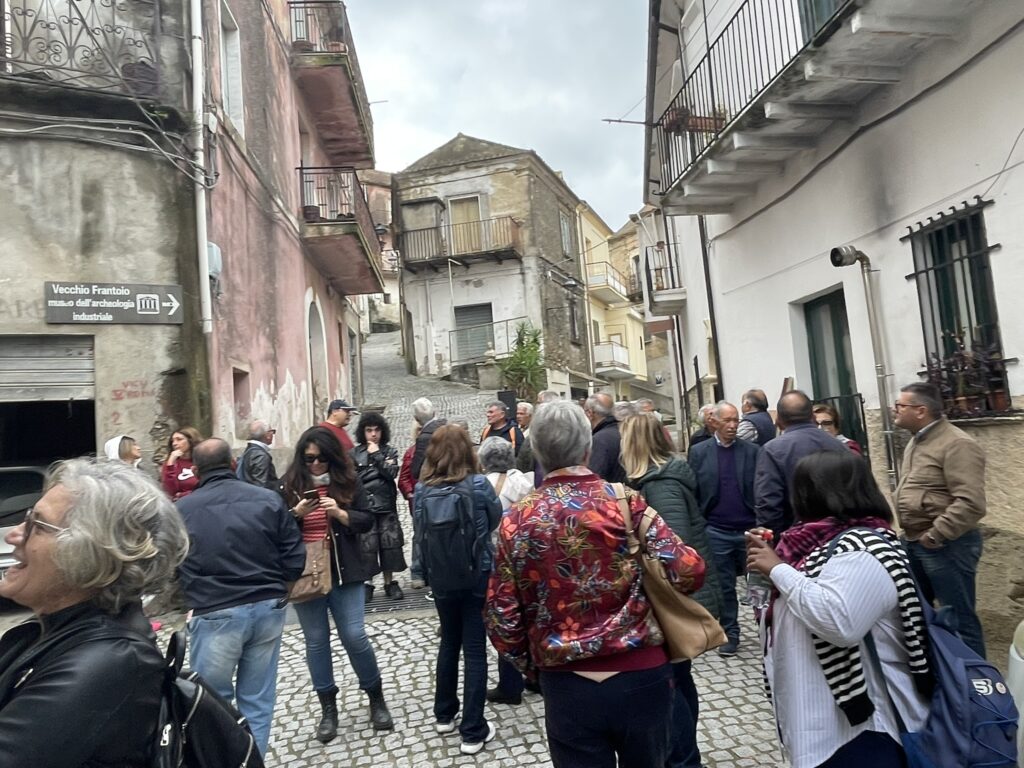 Il percorso, coordinato da Massimo Restuccia, ha previsto la visita al centro storico, ai murales e al museo della fotografia. Le immagini esposte, scattate dal fotografo milanese Ernesto Treccani, in bianco e nero, testimoniano le dure condizioni di vita dei contadini: abitazioni fatiscenti, prive di acqua e luce; bambini denutriti, scalzi, vestiti di stracci; famiglie costrette alla miseria nonostante il lavoro dall’alba al tramonto. La mancanza di cure e di medicine condannava molti a una vita breve e segnata dalla sofferenza.