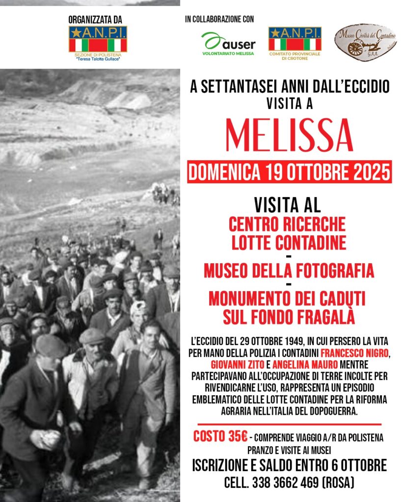 La sezione Anpi “Teresa Gullace” di Polistena (RC), in collaborazione con il Comitato provinciale di Crotone, ha promosso – a sessantasei anni dall’eccidio dei contadini di Melissa – una visita guidata nei luoghi simbolo delle lotte per l’occupazione delle terre incolte.