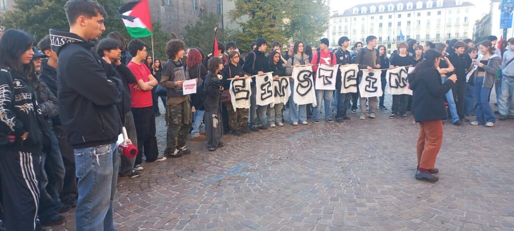 Anche la Scuola per la Pace Torino e Piemonte condanna duramente i fatti: “Oggi, per la seconda volta nell’arco dieci giorni, esponenti dell’organizzazione di estrema destra di Gioventù nazionale si sono recati davanti a una scuola a volantinare, con l’obiettivo di provocare le/gli studenti che nelle scorse settimane sono scesi in piazza per la Palestina e hanno occupato o autogestito le scuole rendendosi così protagonisti nell’alveo del grande movimento italiano per la Palestina”, si legge. Una manciata di ragazze e ragazzi manganellati improvvisamente a freddo mentre entravano a scuola. Questo episodio inaccettabile di gravissima violenza istituzionale rappresenta plasticamente la deriva sempre più autoritaria che nel nostro Paese vuole silenziare e ridurre all’impotenza il vivace movimento studentesco che rivendica libertà e giustizia per la Palestina e per il proprio futuro. Le intimidazioni e le provocazioni, metodi tipicamente riconducibili al fascismo che si stanno moltiplicando ogni giorno, e che oggi a Torino sono stati protetti e sostenuti dalle manganellate dei poliziotti, ci chiamano a scegliere da che parte stare”.