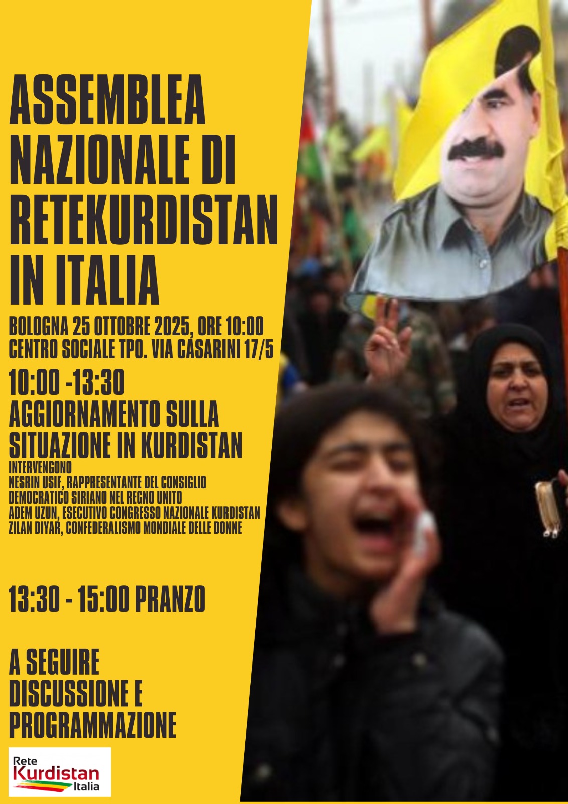 A Bologna presso il Centro sociale TPO si è tenuta, lo scorso 25 ottobre, l’assemblea di Retekurdistan, costituita da organizzazioni che sostengono la causa curda. Al centro della discussione non poteva che esserci il processo di pace in corso e la grave situazione mediorientale. Adem Uzun, esecutivo del Congresso Nazionale del Kurdistan (Knk), ha detto che è necessario “mettere la nostra agenda sul tavolo e perseguirla, dimostrando di avere il potere di portare avanti la nostra visione. Abbiamo bisogno di solidarietà e di alleanze. Ci vogliono dividere e farci ritrovare soli ma noi dobbiamo opporci”. Analizzando la situazione internazionale ha aggiunto: “Siamo in un periodo di transizione. Si tratta di un periodo di caos e noi dobbiamo avere il nostro disegno, il nostro obiettivo. Pensiamo che nel periodo di transizione sia necessaria della flessibilità senza però mai perdere l’obiettivo principale. La flessibilità può essere solo politica ma non ideologica”.