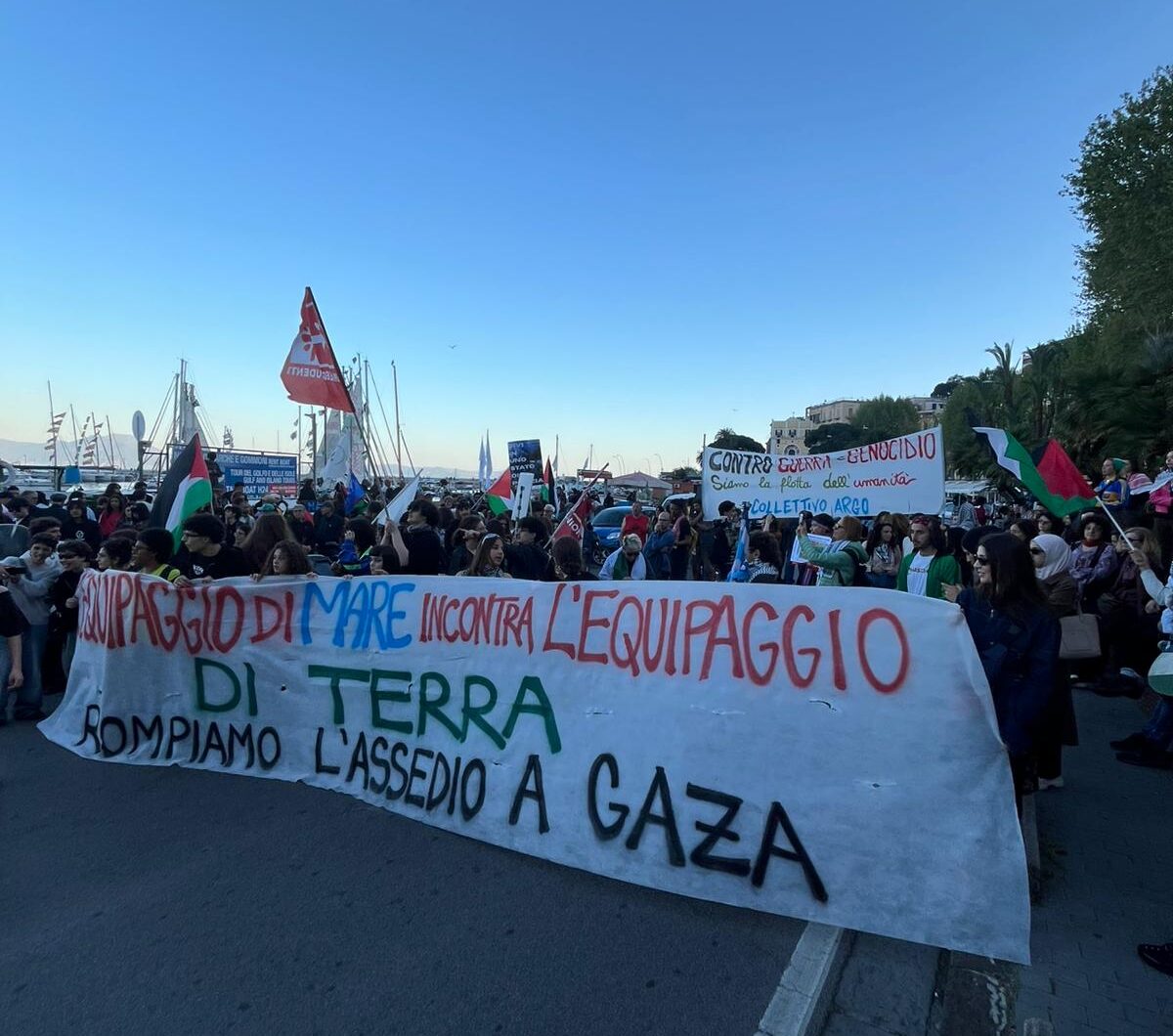 Sabato 11 aprile, centinaia di persone hanno sfilato per le strade della città con bandiere palestinesi e striscioni di solidarietà. Il corteo ha subito un cambio di percorso all’ultimo minuto: la partenza, inizialmente prevista da piazza Vittoria, è stata spostata a corso Vittorio Emanuele per motivi di ordine pubblico, impedendo ai manifestanti di sfilare davanti al consolato americano. Ma la “flotta di terra” – sia pur costretta ad ampia deviazione – è riuscita comunque a ricongiungersi con la flotta di mare, al tramonto.
