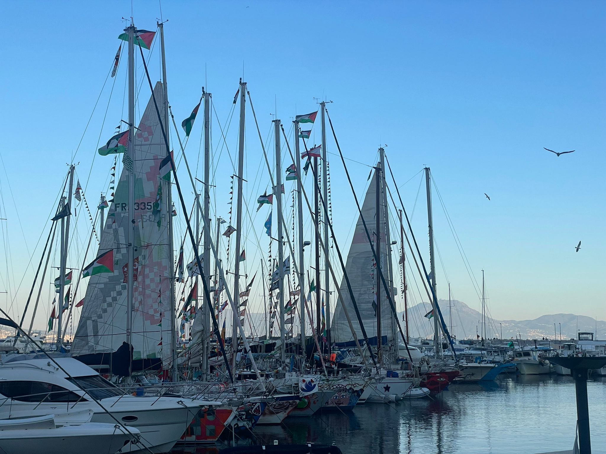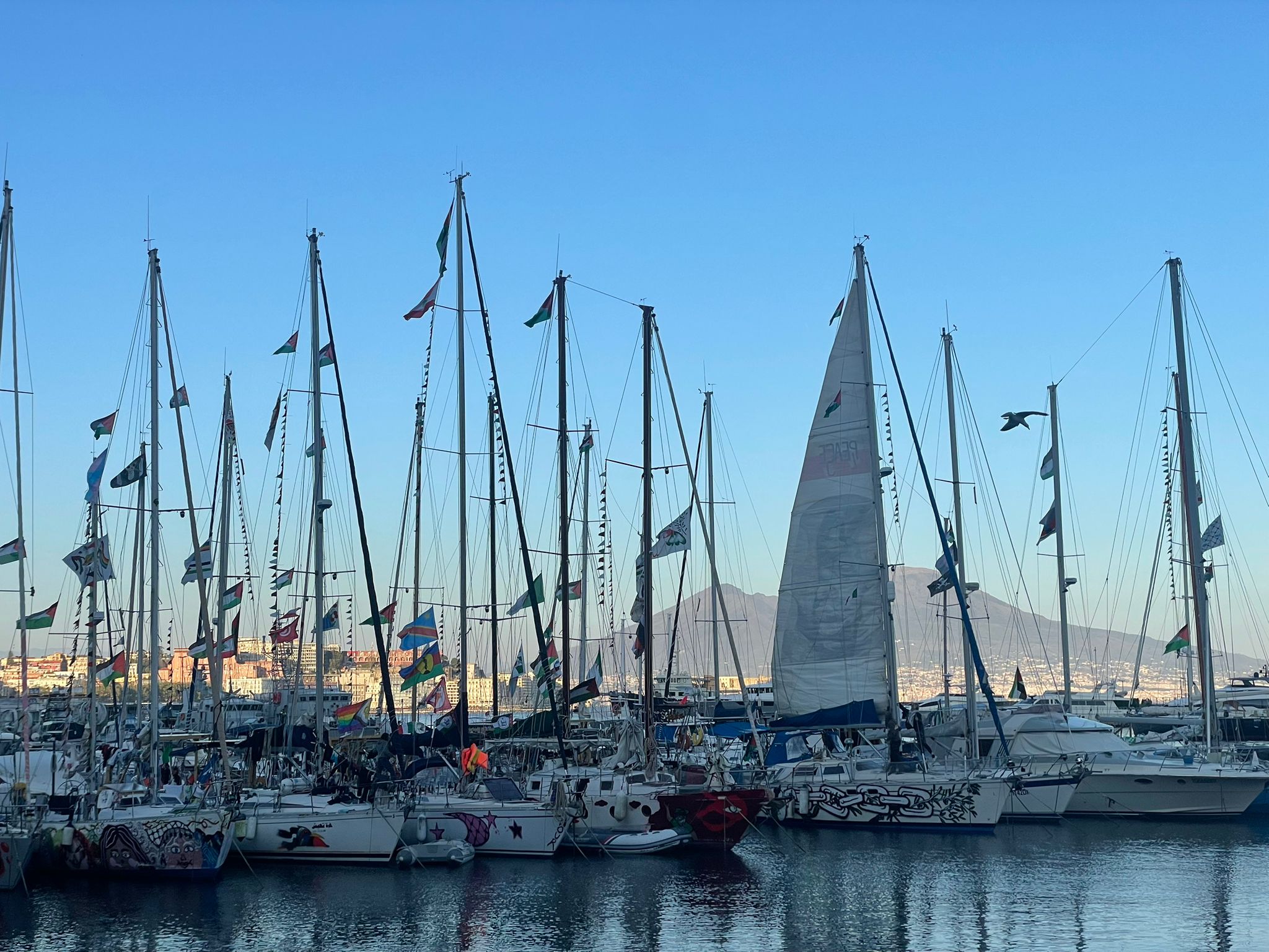 Diciotto imbarcazioni della missione Thousand Madleens to Gaza hanno sostato nel porto di Mergellina, a Napoli. Partite da Marsiglia il 4 aprile e arrivate il 10 aprile, sono ripartite il 13. 110 membri di equipaggio a bordo e più di tremila volontari in cinquantanove Paesi che supportano la missione da terra: logistica, raccolta fondi, mobilitazione politica, accoglienza nei porti di tappa. La flotta fa parte della Freedom Flotilla Coalition (FFC), coalizione internazionale attiva dal 2010 che riunisce diverse campagne nazionali per sfidare il blocco navale di Gaza. Tra esse Freedom Flotilla Italia.