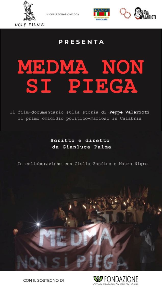È un tributo politico e morale alla storia sommersa di Peppe Valarioti, il primo omicidio ’ndranghetistico in Calabria, quello di “Medma non si piega”, film-documentario del giornalista Gianluca Palma, prodotto da Ugly Films e ANPI comitato provinciale di Reggio Calabria, in collaborazione con la Casa del Popolo Valarioti e Officina N. 8, presentato per la prima volta a Roma l’11 aprile al Nuovo Cinema Aquila – bene confiscato alla Banda della Magliana, di recente, e ancora una volta, bersaglio di atti vandalici e intimidatori – nell’ambito del Festival delle Terre, organizzato dalla ong Centro Internazionale Crocevia.