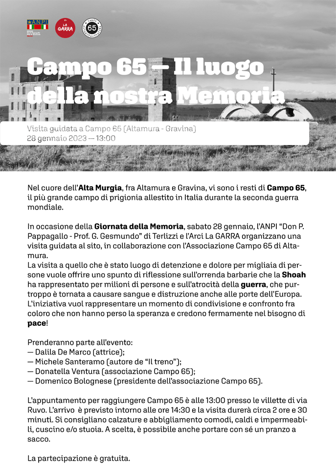 ll presidente nazionale Anpi, Gianfranco Pagliarulo, durante la diretta social ha voluto sottolineare: «Guai a noi! Guai a noi se dimenticassimo la Shoah. Qualche giorno fa Liliana Segre ha lanciato un allarme, ha detto che sente spesso persone che dicono: “basta con questi ebrei, che cosa noiosa, oramai lo sappiamo”. Liliana Segre ha ragione. Il 27 gennaio, Giorno della Memoria. Non è sufficiente. C’è bisogno di qualcosa in più? No; c’è bisogno di qualcosa di meglio. Non basta la liturgia. C’è bisogno di formazione civile. C’è bisogno di conoscenza, di coscienza e di comportamenti adeguati. Spesso oggi la conoscenza è negata, la coscienza è latitante e i comportanti mancano. Parlo in primo luogo della catastrofe della Shoah. Ma parlo anche, per esempio, dei deportati politici italiani e di tutta Europa che sono stati cancellati da decenni dalla memoria collettiva».