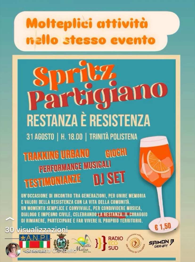 Tra gli appuntamenti simbolici c’è la Pastasciutta Antifascista, organizzata ogni 25 luglio per ricordare la caduta del regime mussoliniano e ribadire i valori della libertà, della democrazia e della giustizia sociale attraverso un gesto semplice e collettivo: condividere un pasto, come fecero i fratelli Cervi nel 1943. Ed è giunta alla terza edizione lo “Spritz Partigiano”, un appuntamento organizzato dalla Sezione di Polistena per avvicinare i giovani ai valori fondanti della democrazia e della libertà attraverso linguaggi nuovi e momenti di condivisione.