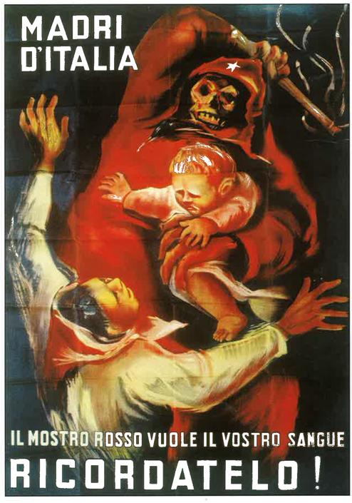 Manifesto Rsi, 1944. Immagine da un libro di Stefano Privato (il Mulino) (da http://www.corriere.it/foto-gallery/cronache/14_gennaio_02/ma-comunisti-mangiano-bambini-manifesti-propaganda-d2144c26-73cb-11e3-8c6d-871530ae059d.shtml#1) - Bisogna pertanto lottare contro il falso presupposto dell’equiparabilità, fatto altrimenti passare come criterio perbenista e di senso comune. La premessa per contrastare la reviviscenza fascista, è infatti il scindere il richiamo alla lotta contro di essa dall’anticomunismo di senso comune, che parifica fenomeni storici distinti ma, soprattutto, usa il giudizio politico abborracciato contro il passato per attenuare o addirittura negare le colpe del fascismo. L’accostamento tra fascismo e comunismo non ha a che fare con un sereno giudizio storico, ma serve a giustificazione del primo. Riprende, anche in questo caso non importa quanto inconsapevolmente, la falsa teoria del fascismo come risposta al comunismo. L’anticomunismo dei giorni nostri non è mai autentico e sincero rifiuto della dittatura stalinista, come invece viene da certuni presentato. Semmai costituisce la copertura e lo sdoganamento dei crimini del regime mussoliniano, e dei suoi epigoni in età repubblicana, attraverso la riproposizione, al pubblico, di una visione della politica come di un campo degli orrori, dove tutte le posizioni si equivarrebbero, richiedendo quindi che sia un qualcuno di onnisciente (il “duce”) ad incaricarsi, al posto della collettività, di neutralizzarne le ricadute negative. L’antifascista non può né deve cadere in questa trappola, che finge di volere tutelare il «popolo» quando, invece, gli sottrae qualsiasi facoltà critica, mettendo sullo stesso piano storie diverse per poi sentenziare che solo il “governo di un capo” può trovare le giuste risposte ai dilemmi del presente.