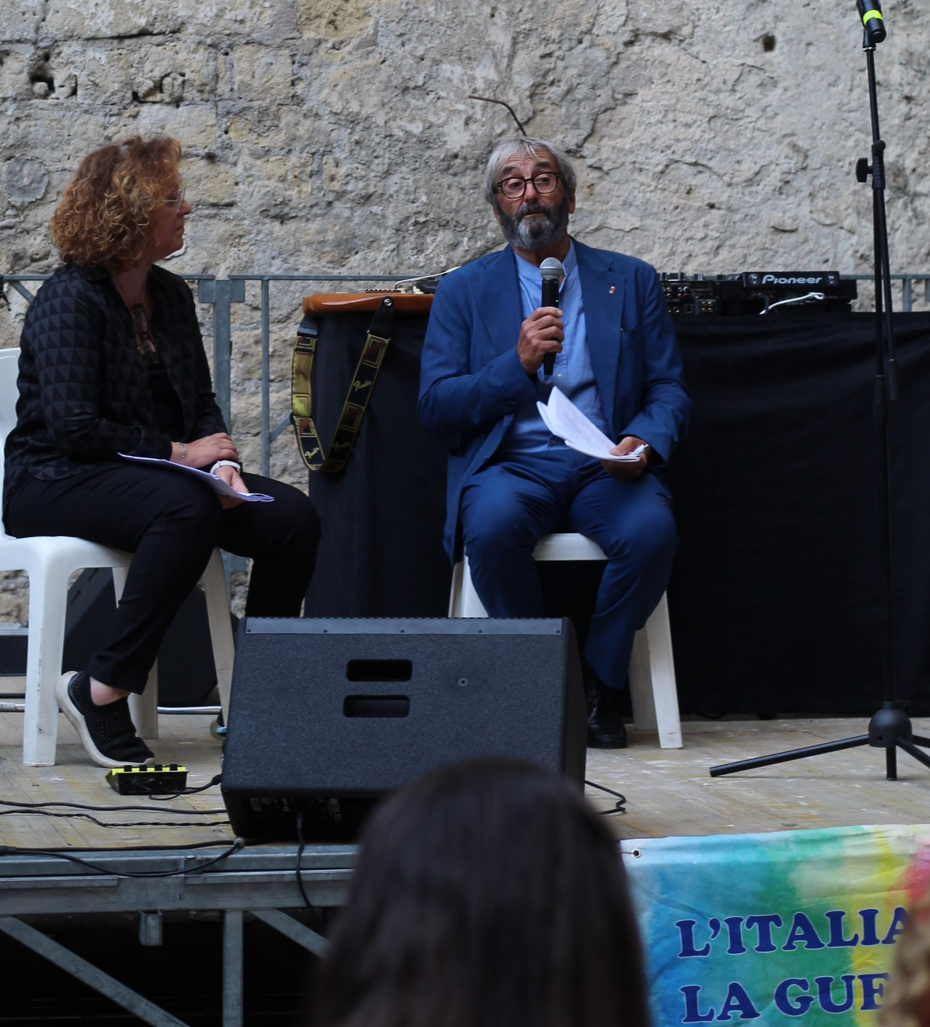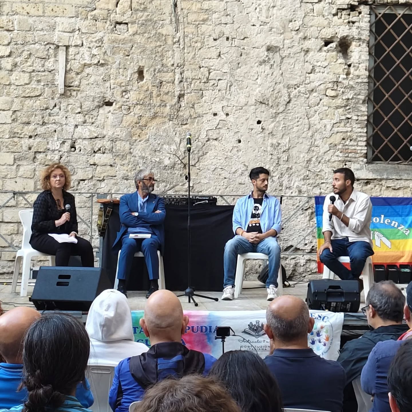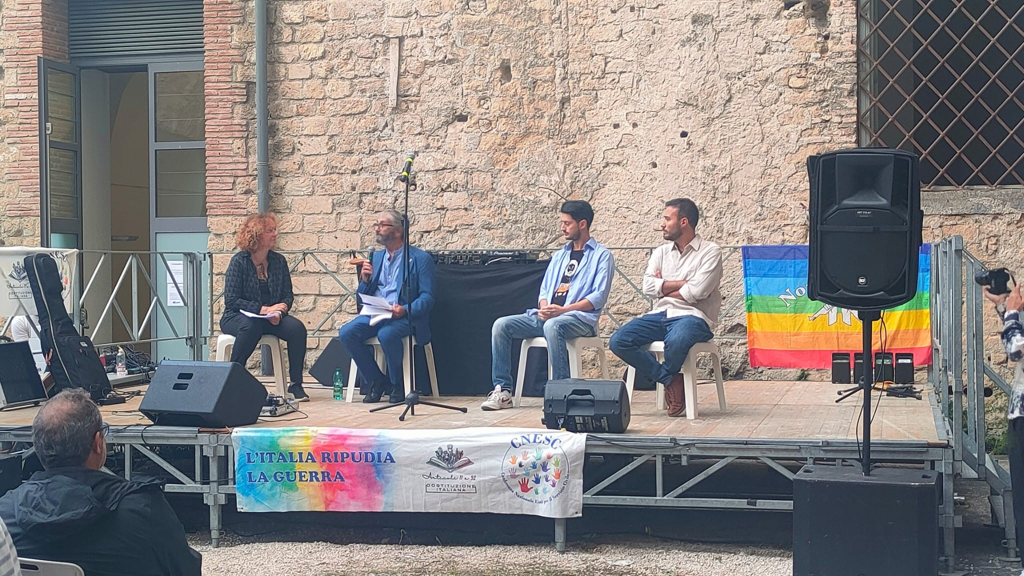 Gennaro Giudetti si occupa di migrazioni e difesa dei diritti umani nelle zone di conflitto. Appena rientrato da Gaza, gli hanno negato la possibilità di rientrare: ha testimoniato con parole dure, vive e sincere la situazione in cui versano i palestinesi a Gaza, ospedali bombardati, uso criminale del doppio bombardamento per colpire i soccorritori, strage di bambini e tutto quanto ci è tristemente noto. Entrambi gli interventi ci hanno riportato alla realtà del lavoro dei tanti volontari e anche al ruolo degli operatori per la pace. L’articolo 11 della Costituzione spiccava sotto il palco. L’intervento di Rossano Salvatore e la storia degli obiettori di coscienza, il ruolo del Servizio Civile Universale, le tante associazioni che sono impegnate su questo fronte, temi affrontati in tanti interventi ci richiamano fortemente alla necessità che la difesa della pace, contro il riarmo indiscriminato, sia un elemento che unisce tutte e tutti.
