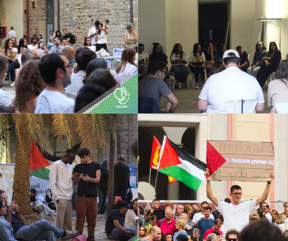 Gennaro Giudetti si occupa di migrazioni e difesa dei diritti umani nelle zone di conflitto. Appena rientrato da Gaza, gli hanno negato la possibilità di rientrare: ha testimoniato con parole dure, vive e sincere la situazione in cui versano i palestinesi a Gaza, ospedali bombardati, uso criminale del doppio bombardamento per colpire i soccorritori, strage di bambini e tutto quanto ci è tristemente noto. Entrambi gli interventi ci hanno riportato alla realtà del lavoro dei tanti volontari e anche al ruolo degli operatori per la pace. L’articolo 11 della Costituzione spiccava sotto il palco. L’intervento di Rossano Salvatore e la storia degli obiettori di coscienza, il ruolo del Servizio Civile Universale, le tante associazioni che sono impegnate su questo fronte, temi affrontati in tanti interventi ci richiamano fortemente alla necessità che la difesa della pace, contro il riarmo indiscriminato, sia un elemento che unisce tutte e tutti.