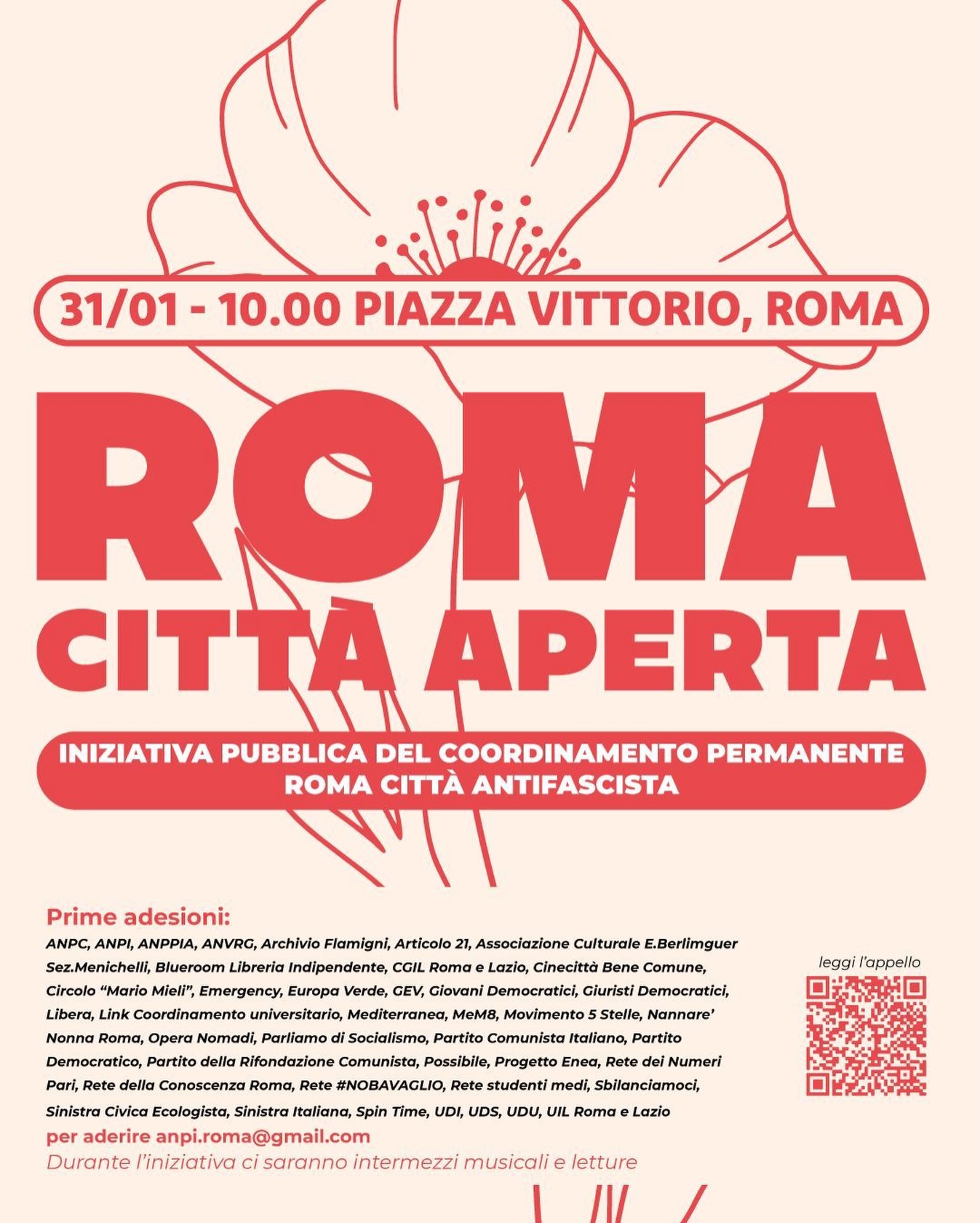 AAMOD, ADI Roma, AICVAS Roma, ANED Roma, ANPC, ANPI, ANPPIA, ANVRG Roma, Archivio Flamigni, Articolo 21, Artisti Resistenti, Associazione Carteinregola, Ass. Culturale Enrico Berlinguer sez. Menichelli, Ass. Culturale Pro Loco San Lorenzo, Ass. della Repubblica per la storia dell’Italia Repubblicana ETS, Ass. Memoria degli Stermini Dimenticati, Ass. Parliamo di Socialismo, Assopace Palestina, Attac Roma, AUSER Lazio, Blue Room Libreria indipendente, CADI (Com. Antirazzista Durban), CGIL Roma e Lazio, Cinecittà Bene Comune, Circolo Culturale “Saragat Matteotti”, Circolo “Mario Mieli”, Comitato Antirazzista Durban Italia, Comitato Italiano Lula Livre, Comitato Monteverde per la Pace, Comitato Piazza Vittorio Partecipata, Confederazione Comunista Roma, Coordinamento Associazioni Lazio Mobilità Alternativa, Emergency, Europa Verde, GEV, Giovani Democratici, Giuristi Democratici, Gruppo Capitolino E.V. – Alleanza Verdi Sinistra, Healing and Freedom Movement Italia /USA, Libera, Link Coordinamento universitario, Mediterranea, MeM8, Movimento 5 Stelle, Nannarè, Nonna Roma, Opera Nomadi, Partito Comunista Italiano, Partito Democratico, Partito della Rifondazione Comunista, +Europa Roma, Polo Civico Esquilino, Possibile, Progetto Enea, Progetto Glicine 118, Radicali Roma, Retake, Rete dei Numeri Pari, Rete della Conoscenza Roma, Rete #NOBAVAGLIO, Rete studenti medi, Rete Yekatit 12-19 febbraio, Reti di Pace, Risorgimento socialista, sezione di Roma/Lazio, Sbilanciamoci, Sinistra Civica Ecologista, Sinistra Italiana, Spin Time, Tutti per Roma Roma per tutti, UDI, UDS, UDU, Ugs (Unione Giovani di Sinistra), UIL Roma e Lazio, Ygrò A.p.s.