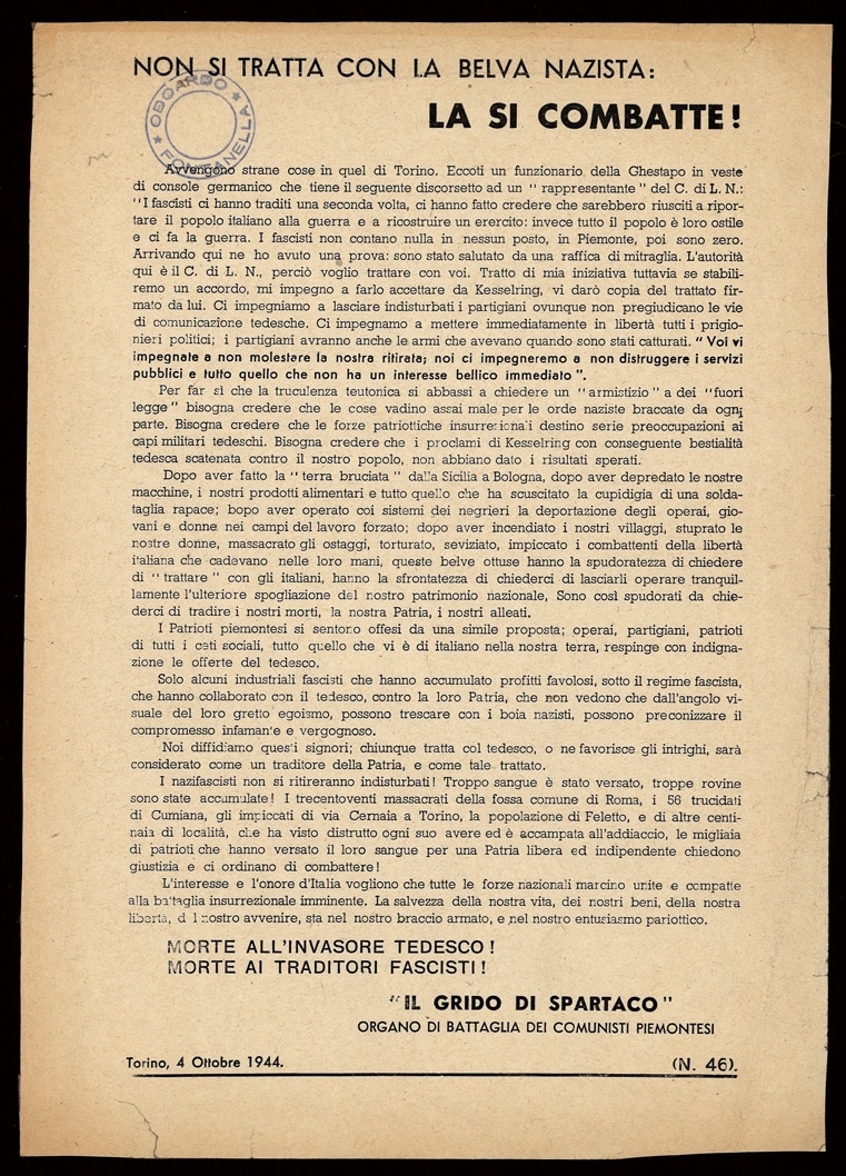 Monarchia e fascismo erano egualmente responsabili del disastro e dopo l’8 settembre, con la Resistenza, furono assieme travolti. Le avanguardie operaie sempre più forti passarono dalle fabbriche alle città e alle montagne con la guerriglia assieme ai contadini, agli studenti, ai soldati e a quanti di ogni ceto e professione in tendevano riacquisire a se stessi ed al Paese libertà e dignità.