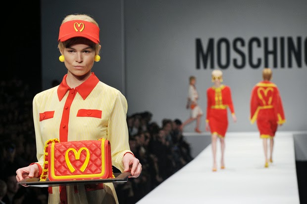 Il fiume in piena della moda, però, ha trovato in Jeremy Scott un altro grande protagonista e provocatore. Lo stilista, nel riattualizzare il marchio Moschino, ha abituato a immersioni nell’immaginario collettivo, dominato da figure come Barbie, i Looney Tunes, SpongeBob SquarePants e Mickey Mouse. I capi d’abbigliamento e gli accessori che sfilano sulle sue passerelle sono un trionfo di icone, emblemi immediatamente riconoscibili che attingono a un universo di fantasia, patinato e pubblicitario. La collezione Autunno/Inverno 2014/’15 disegnata dallo stesso Scott ha, invece, reso protagonista il logo McDonald’s che, piegato alle necessità stilistiche del designer, è diventato l’iniziale di Moschino. L’accostamento di colori – giallo e rosso – era quello tipico della multinazionale, che però si posava su abiti eleganti, tailleur, pochette.