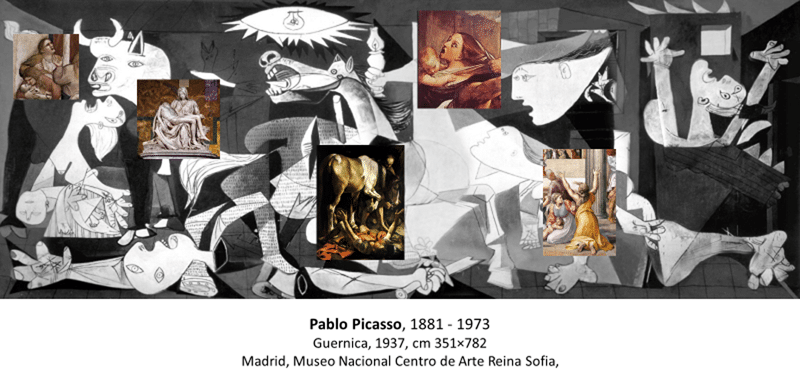 Il dolore, la sconfitta, la morte, la pietà, la liberazione, il riscatto, la resurrezione sono contenuti ben presenti in Guernica, accompagnati dalla necessità di esprimere da un lato dei sentimenti personali, dall’altro di renderli collettivi e immediatamente comprensibili. Una via breve e funzionale è guardare alle opere del passato già portatrici degli umani sentimenti. Non è certo nascosto l’interesse dell’artista per la pittura italiana, in particolare quella cristiana vocata alla “distinzione” tra bene e male, come nota è l’attenzione per le debolezze terrene; e la storia dell’arte, per Picasso, è una fonte da cui raccogliere immagini che descrivono le miserie umane e contemporaneamente presenziano il sovrannaturale.