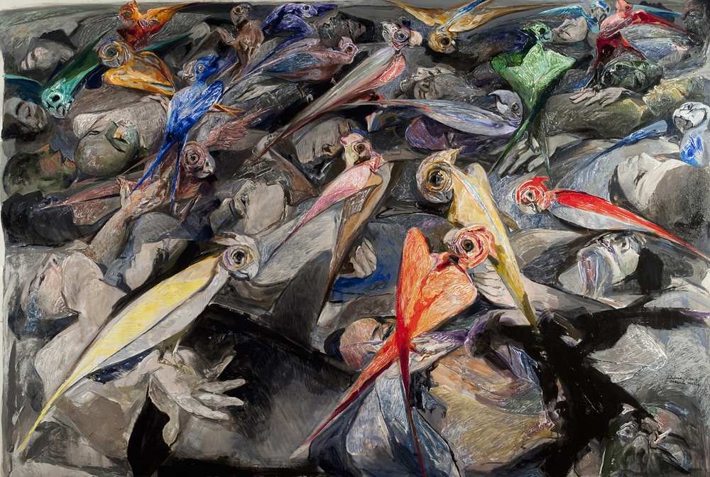 Calabria ama definirsi un “pittore sociale”, interessato alla complessità della dimensione umana, compromessa dentro le vicissitudini della storia. Consapevole dello spaesamento in cui viviamo, l’artista con il suo figurativismo visionario indaga la condizione umana, offrendo al pubblico una pittura che va oltre l’estetica e diventa un documento antropologico. Calabria vive sulla propria pelle l’evoluzione della storia, passando dal sentimento combattente degli anni Sessanta e Settanta ad una propensione più intimista, dove la collettività organizzata lascia spazio all’individuo nel proprio tempo, consapevole della crisi ideologica in cui viviamo. «Ci troviamo di fronte a contraddizioni che ci divorano – riflette Calabria –. Viviamo la presunzione dei nostri livelli culturali e, allo stesso tempo viviamo in una società che esilia tutto ciò che è complesso. Con la mia pittura vorrei cogliere la sostanza di alcune trasformazioni che stanno attraversando la società contemporanea. Questo è lo scopo della mia pittura». Trasformazioni che hanno coinvolto molti aspetti della vita umana, prima fra tutti la politica: «Prima c’era un amore per la politica, perché questa aveva necessità di entrare in relazione con la cultura della società. Il rapporto con la politica era un rapporto con se stessi. Era anche un rapporto con la nostra diversità, con il nostro riconoscersi in alcuni ideali, motivo per cui mi sono avvicinato al Partito comunista, lavorando anche al Sindacato artistico. Oggi invece lo stato attuale della politica si è traslata in una sorta di spazio pragmatico, non ha più capacità di previsione perché è parte integrante di un modello di sviluppo che ha delle sue leggi. La strada che ci si propone è la solitudine o la totale identità dentro il conformismo».