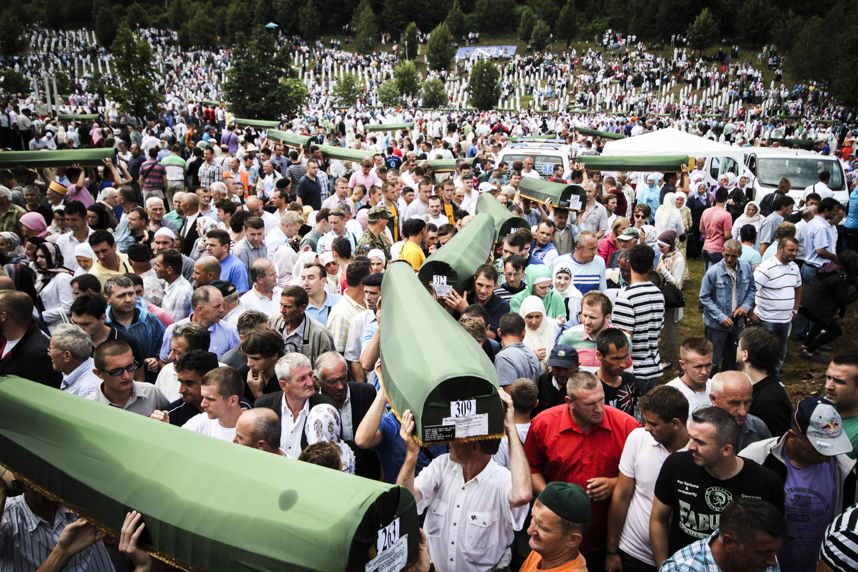Durante la guerra in Bosnia-Erzegovina, nel luglio 1995, a Srebrenica vennero trucidati oltre 8.000 bosgnacchi (bosniaci musulmani) per mano delle truppe serbo-bosniache (appoggiate dal gruppo paramilitare gli Scorpioni) comandate dal generale Ratko Mladić. Si tratta del più grande massacro in Europa dopo l’olocausto, ampliato dal fatto che tutto il territorio colpito fosse stato dichiarato zona protetta dall’Onu, sotto la tutela di un contingente olandese dell’Unprofor. Ogni anno, nel giorno della commemorazione presso il memoriale di Potocari, nuove bare vengono issate in spalla e preparate per la sepoltura. La conta dei morti non è ancora terminata.