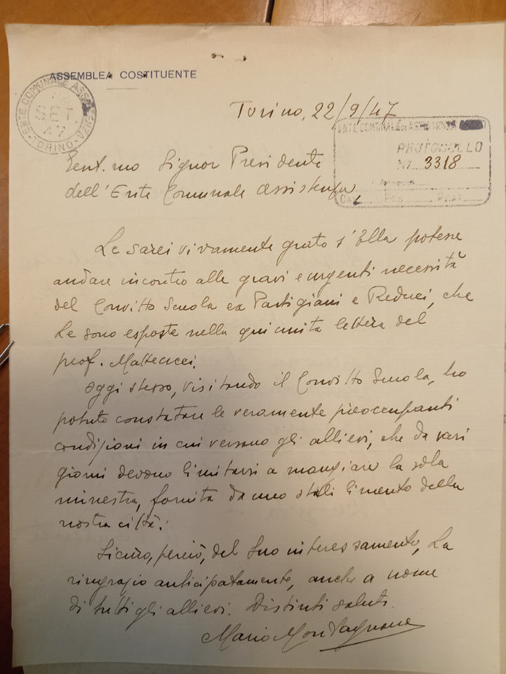 Alla mostra sono esposti molti documenti dell’epoca, ma questo è stato riservato in esclusiva ai lettori di Patria: su carta intestata dell’Assemblea Costituente, Mario Montagnana chiede un intervento per gravi carenze alimentari degli studenti (e anche dei prof…)