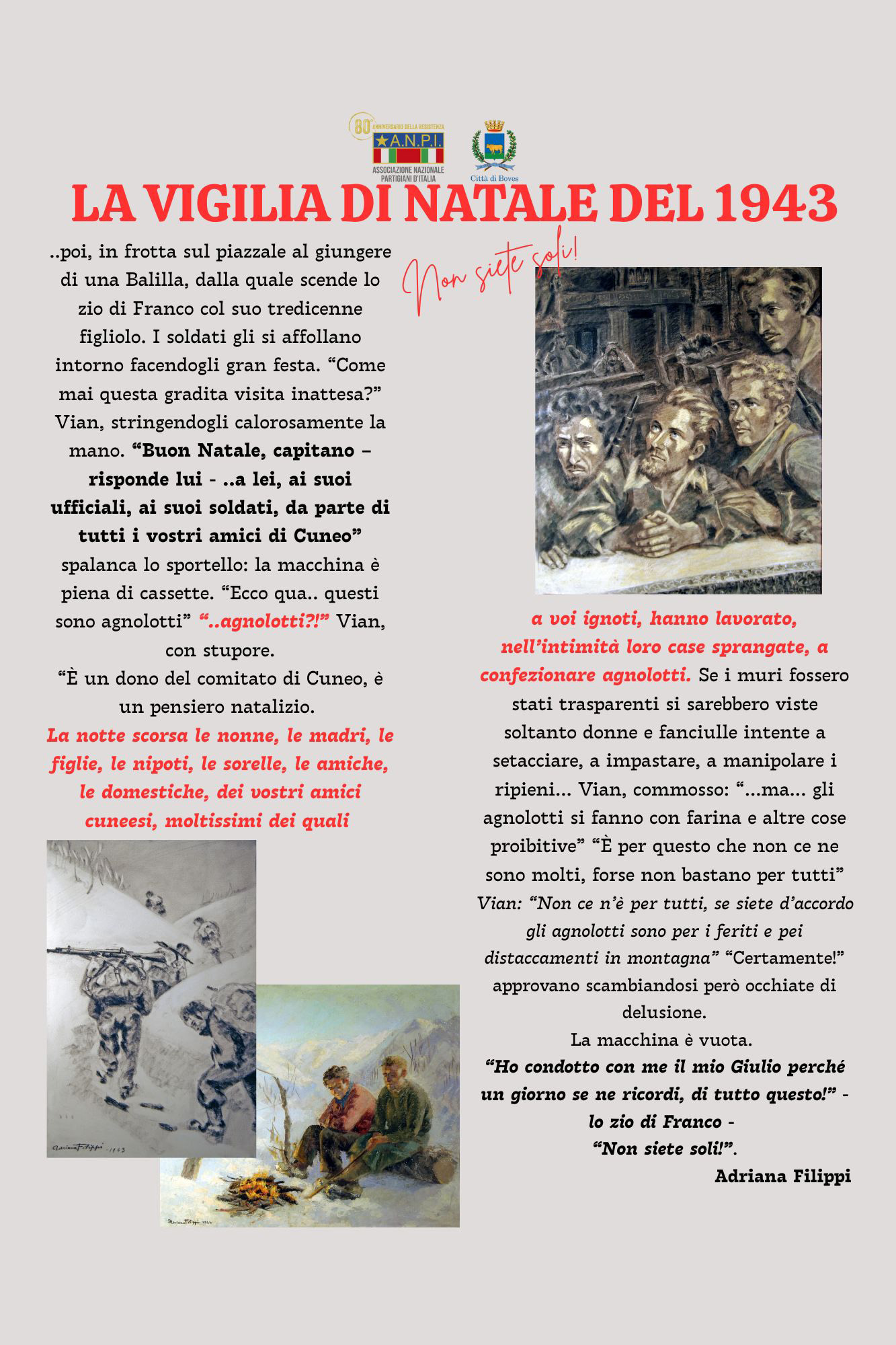 Queste e tante altre storie, anche divertenti, sono riportate nei pannelli della mostra. Racconti che indicano la via ancora oggi. Come quanto accadde il giorno della Vigilia di Natale del 1943. Le donne di Cuneo (madri, sorelle, figlie, amiche) dei partigiani e delle partigiane cucinarono gli agnolotti per i resistenti, lo fecero con le finestre sprangate, perché c’era il coprifuoco e perché usavano materie prime proibite (non potevano tenere così tanta farina nelle loro case, ma solo quella razionate, prevista dalla tessera annonaria).