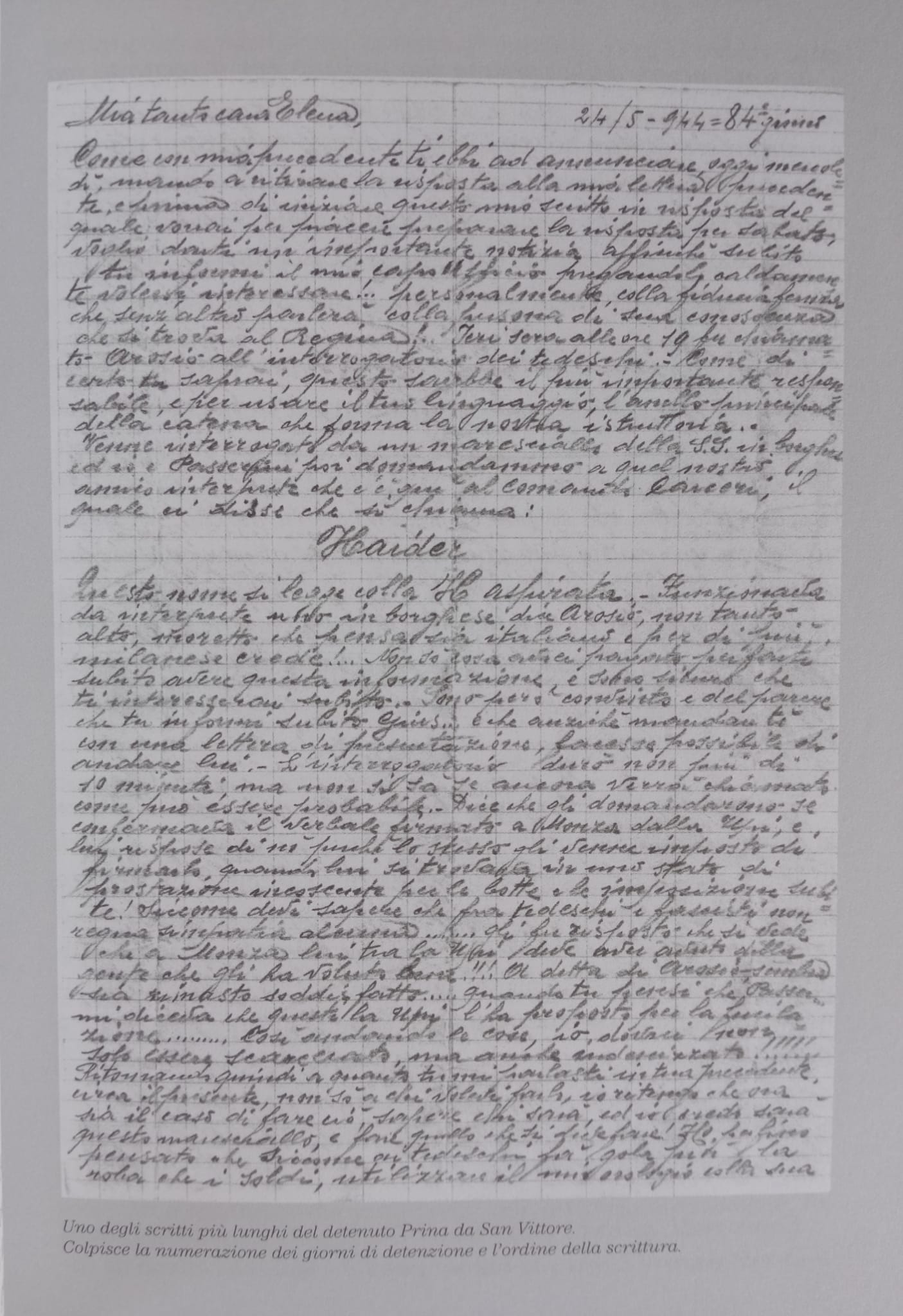 Ossatura del volume sono le lettere clandestine e autorizzate che l’antifascista monzese indirizzò alla moglie Elena Mauri e che, tra le altre cose, rivelano uno spaccato della vita dei luoghi di prigionia, le firme sui verbali imposte in “stato di prostrazione incosciente per le botte e le imposizioni subite”, il dramma degli ebrei, l’utilizzo della tortura e l’opportunità, rara, di conoscere l’animo di chi viene privato illegittimamente della propria libertà. “Una corrispondenza – afferma il presidente della Fondazione Fossoli, Pierluigi Castagnetti, nella prefazione del libro – attorno a cui è stata costruita questa originale biografia del dolore”. Un patrimonio straordinario che gli eredi Prina hanno conservato come una reliquia e che hanno donato alla fondazione durante la campagna “Salva una storia” lanciata dalla Fondazione per essere adeguatamente conservate, analizzate e messe a disposizione della comunità internazionale di studiosi.