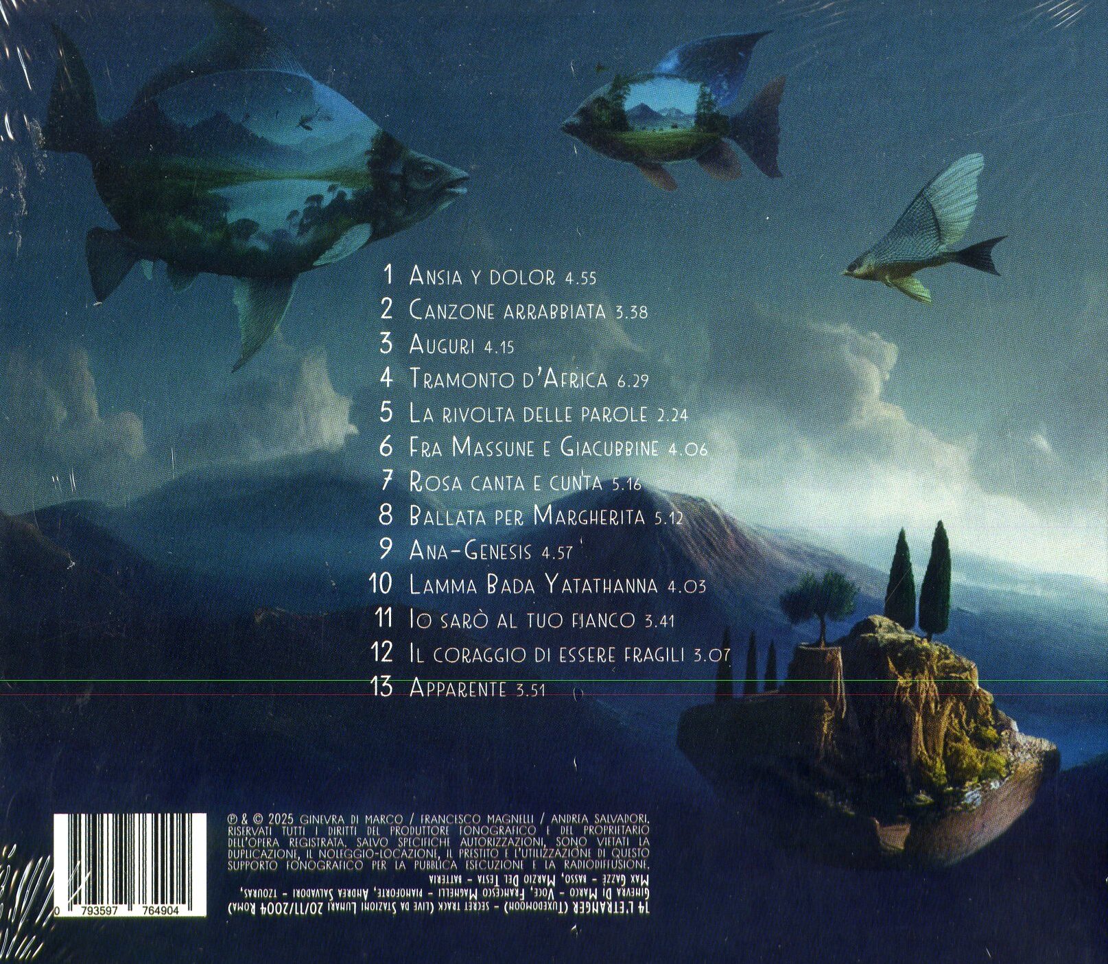 💿 Tredici tracce (più una pazzesca secret track, L’etranger, versione live da Stazioni Lunari, Roma, novembre 2004, testo e musica Steven Allan Brown, Peter Principle, Blaine Leslie Reininger, Winston Tong) in cui Di Marco, con Francesco Magnelli e Andrea Salvadori, ha dato forma a un mondo in cui gli esseri che abitano le acque solcano i cieli (suggestive le immagini di copertina), sopravvivono oltre i margini del loro habitat per respirare aria tersa, ben oltre le più alte vette. Un mondo capovolto in cui l’arte non si assoggetta al mercato e le canzoni infrangono ogni principio di serialità, stando al di fuori dei meccanismi della produzione discografica che appiattisce e uniforma suoni, ritmi, parole.